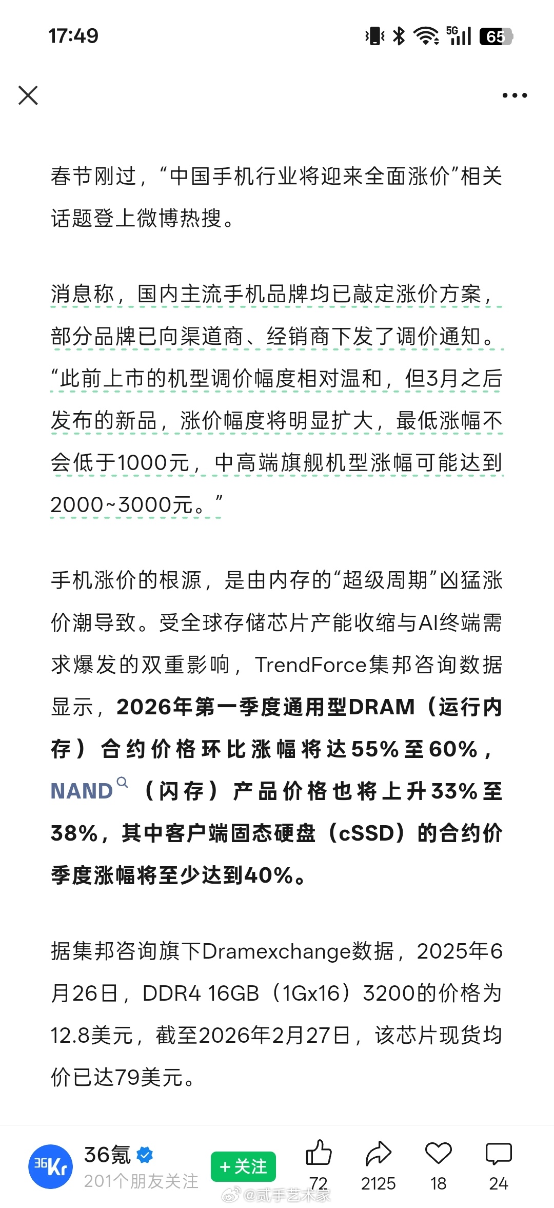春节后内存正经历一轮超预期暴涨。数据显示,2026年第一季度,通用内存芯片合约价环比涨幅高达55%—60%,部分芯片现货价更是在八个月内从12.8美元飙升至79美元。