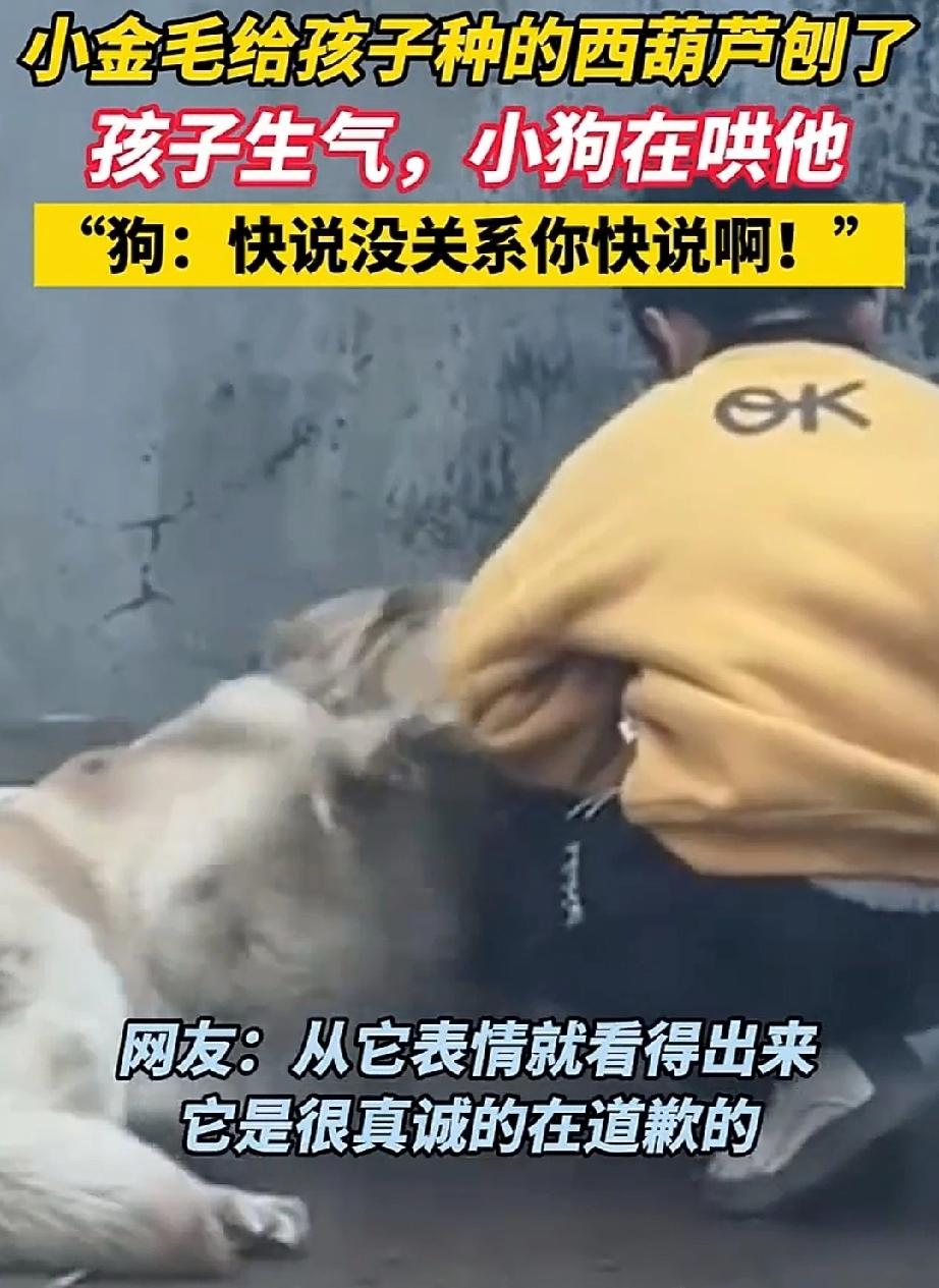 2月27日,山东。男孩在院子里种了一棵西葫芦,来给幼苗浇水。走近一看,傻眼了,只见幼苗被刨了出来,倒在一边蔫了。 这棵幼苗是男孩从种子开始种,每天都忘不了给它浇水,看着它冒出来嫩芽,长出了绿叶。满心期待能看到它开花,结出西葫芦瓜。可是这一切都毁了,男孩很伤心 男孩有条心爱的宠物犬小金毛,关系极好,常陪伴男孩给西葫芦浇水。它也好奇,这土里怎么浇了水,就能冒出了芽,长出了苗。刨开土想一看究竟。结果犯了错,让男孩很伤心。 金毛很过意不去,蹲在男孩身边,望着他,把前肢搭在他的胳膊上,传达它的愧疚和歉意。 男孩正伤心,甩开金毛的前肢,表示不接受它的道歉。金毛不气馁,再一次搭在男孩的手上。意思是说,谁不会犯错。原谅我吧,别生气啦,往后我保证听你的话,不再犯类似错误的。 在成长的路上,不管是动物还是人,都有探知世界的欲望,有时会犯错。可以说是在纠错的过程中成长。 小狗刨孩子种的西葫芦后哄人成长 人与宠物 金毛