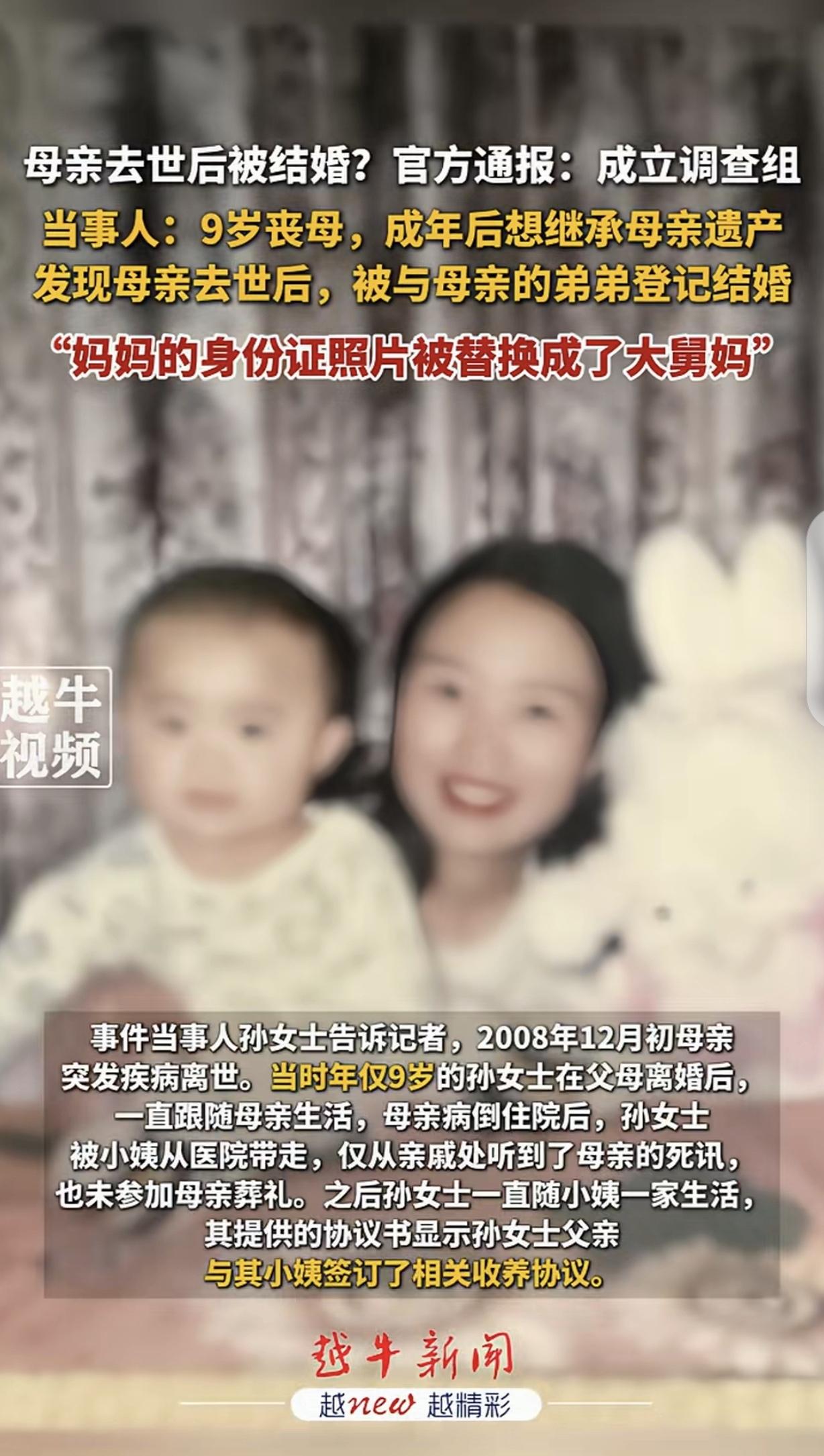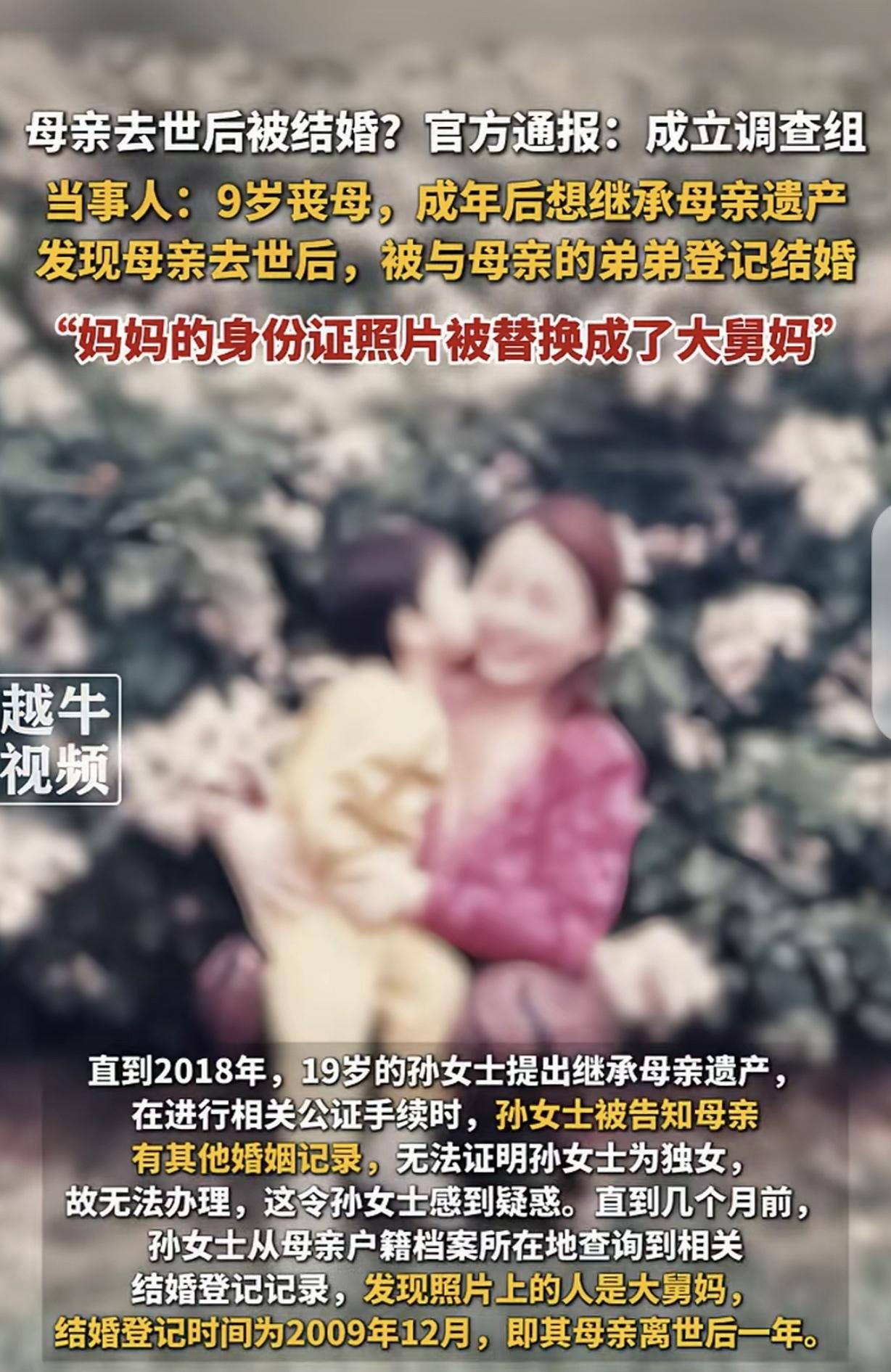 “吃绝户!”河南平顶山,一女子父母离异,她跟母亲生活,9岁时,母亲重病入院,她被小姨带走,也没能参加母亲葬礼,女子19岁时,准备继承母亲遗产,却惊讶的发现,她母亲去世一年后,竟然跟舅舅“登记结婚”,照片却是舅妈,母亲身份证照片也被替换成舅妈,所以,她无法证明自己是独生女,不能继承遗产。女子问舅舅这是咋回事?舅舅说,是为了给她解决上学手续,这不胡扯吗?女子一直跟小姨一起生活,上学跟舅舅家有啥关系?女子痛哭:不知道我该相信谁?网友:这个舅舅吃绝户呀?小姨也不可能不知道,一家人算计一个孩子! 孙女士是个可怜人,父母在她很小的时候就离婚了,她跟母亲一起生活,相依为命。 可在她9岁那年,母亲积劳成疾,疾病缠身,住进了医院,她小小年纪,就在医院承担起照顾母亲的责任。 后来,父亲跟小姨签了收养协议,小姨把她接回家,她和母亲这一别,就是生离死别,阴阳相隔。 2008年12月初,母亲还是没挺过去,病重离世了,孙女士没能送母亲最后一程,参加她的葬礼。 时光荏苒,一晃10年过去了,孙女士已经从少不更事,出落的亭亭玉立,19岁的她觉得自己成年了,应该继承母亲的遗产了。 可万万没想到,她在做公证时,工作人员告诉她,她母亲还有一段婚姻,所以,孙女士无法证明自己是独生子女,无法继承。 孙女士直接懵圈,母亲人都离世了,何来婚姻?这是怎么回事? 为了搞清楚原因,孙女士去了母亲户籍档案所在地查询,却惊讶的发现,在母亲去世后一年,也就是2029年12月,母亲竟然跟舅舅“登记结婚了”。 虽然身份信息是母亲,但照片却是舅妈,母亲身份证照片也变成了舅妈。 孙女士百思不解,为什么是这样?舅舅这么做的目的是什么?她问舅舅咋回事? 舅舅却说,之所以这么做,是解决孙女士当年的上学问题。 这不胡扯吗?孙女士被小姨收养,上不上学的,跟舅舅有啥关系?这明显是谎言。 孙女士很伤心,她觉得舅舅这么做,一定有不可告人的目的,她不知道还能相信谁?她决定进行举报。 目前,相关部门已经介入。 有人说,你们觉得这是他舅舅弄的,我觉得是她姥姥弄的,男的就没有这么多弯弯绕绕。舅舅和小姨不是姐弟吗?小姨不可能不知道啊! 所谓的舅舅、舅妈,吃相太难看了!人世间,只有钱,才是真正的照妖镜。 这事儿看下来让人心里特别不是滋味,孙女士的遭遇真的太让人心疼了。 父母离婚后,她跟着母亲好不容易长大,母亲重病去世后又被小姨收养,本就没享受过多少安稳的亲情,结果到头来还被亲舅舅算计。 舅舅这种行为简直就是“吃绝户”,为了霸占姐姐的遗产,竟然用死人的身份信息登记结婚,还拿外甥女上学当借口糊弄人,这谎言编造得也太拙劣了。 更让人寒心的是,网友们怀疑小姨也知情,如果是真的,那就是一家人合起伙来算计孙女士,完全把亲情抛到了九霄云外。 在利益面前,有些人真是把人性最阴暗的一面展现得淋漓尽致。 钱固然重要,但为了钱丢掉做人的底线,伤害自己的亲人,这种做法实在令人不齿。 孙女士选择举报舅舅,是她维护自己合法权益的正确选择。 希望能尽快查明真相,还孙女士一个公道,让那些唯利是图的人受到应有的惩罚。 《民法典》第1127条规定,遗产按照下列顺序继承:(一)第一顺序:配偶、子女、父母;(二)第二顺序:兄弟姐妹、祖父母、外祖父母。继承开始后,由第一顺序继承人继承,第二顺序继承人不继承;没有第一顺序继承人继承的,由第二顺序继承人继承。 在本案例中,舅舅通过非法手段与逝者登记结婚,试图以配偶身份继承遗产,这种行为严重侵犯了孙女士的继承权,是无效且违法的。 对此,你怎么看? 关注@运良说法 学法律知识不迷路