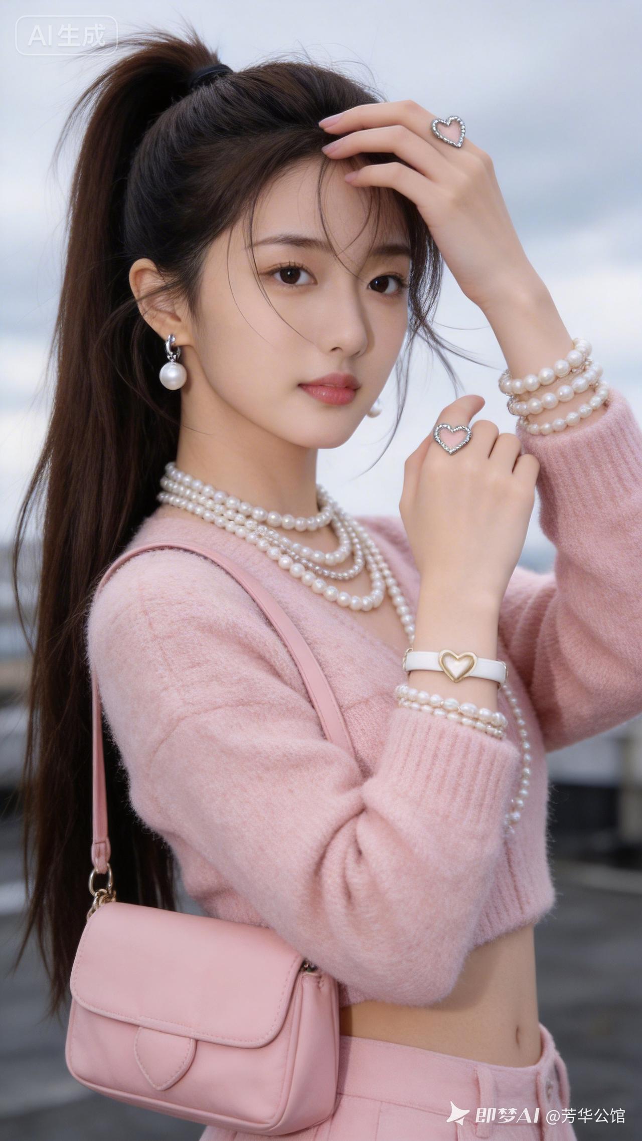 少女棕色高马尾及腰,碎发慵懒贴脸,指尖轻捻发丝。粉色冬季穿搭软糯可爱,珍珠首饰精致亮眼,甜美纯欲,幼态网感脸,电影级光线,超清晰少女写真。
