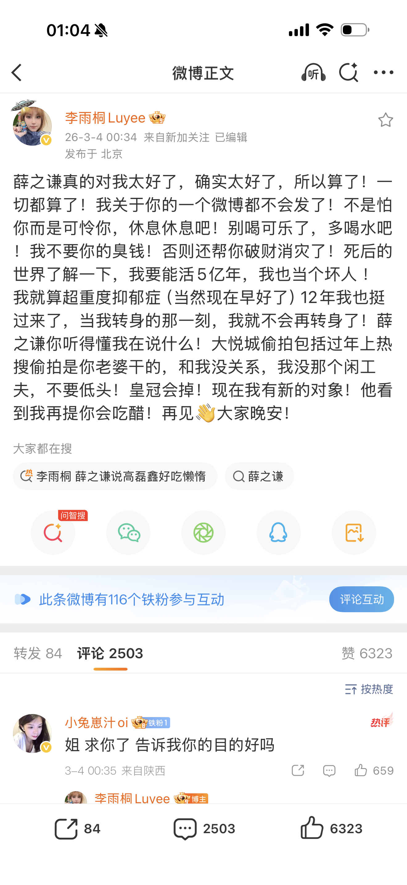 笑死我了,疑似李雨桐薛之谦事件大结局了,真的网友别乱站队,李雨桐文字间能看出她超爱薛之谦,人家疯闹完自己原谅一切和好如初,网友站队里外不是人,总结就是你们又被当成人家的play一环了。