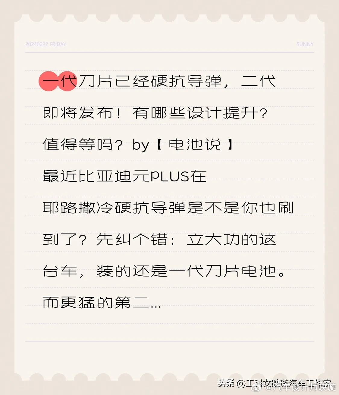 by【电池说】最近比亚迪元PLUS在耶路撒冷硬抗导弹是不是你也刷到了?先纠个错:立大功的这台车,装的还是一代刀片电池。而更猛的第二代刀片电池,马上要在3月5日比亚迪颠覆性技术发布会上正式亮相。