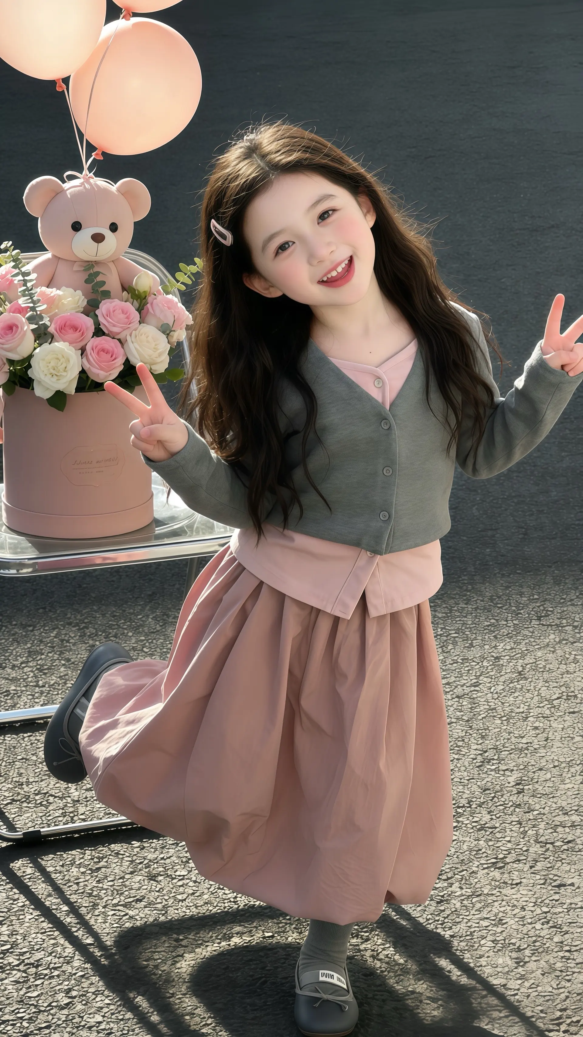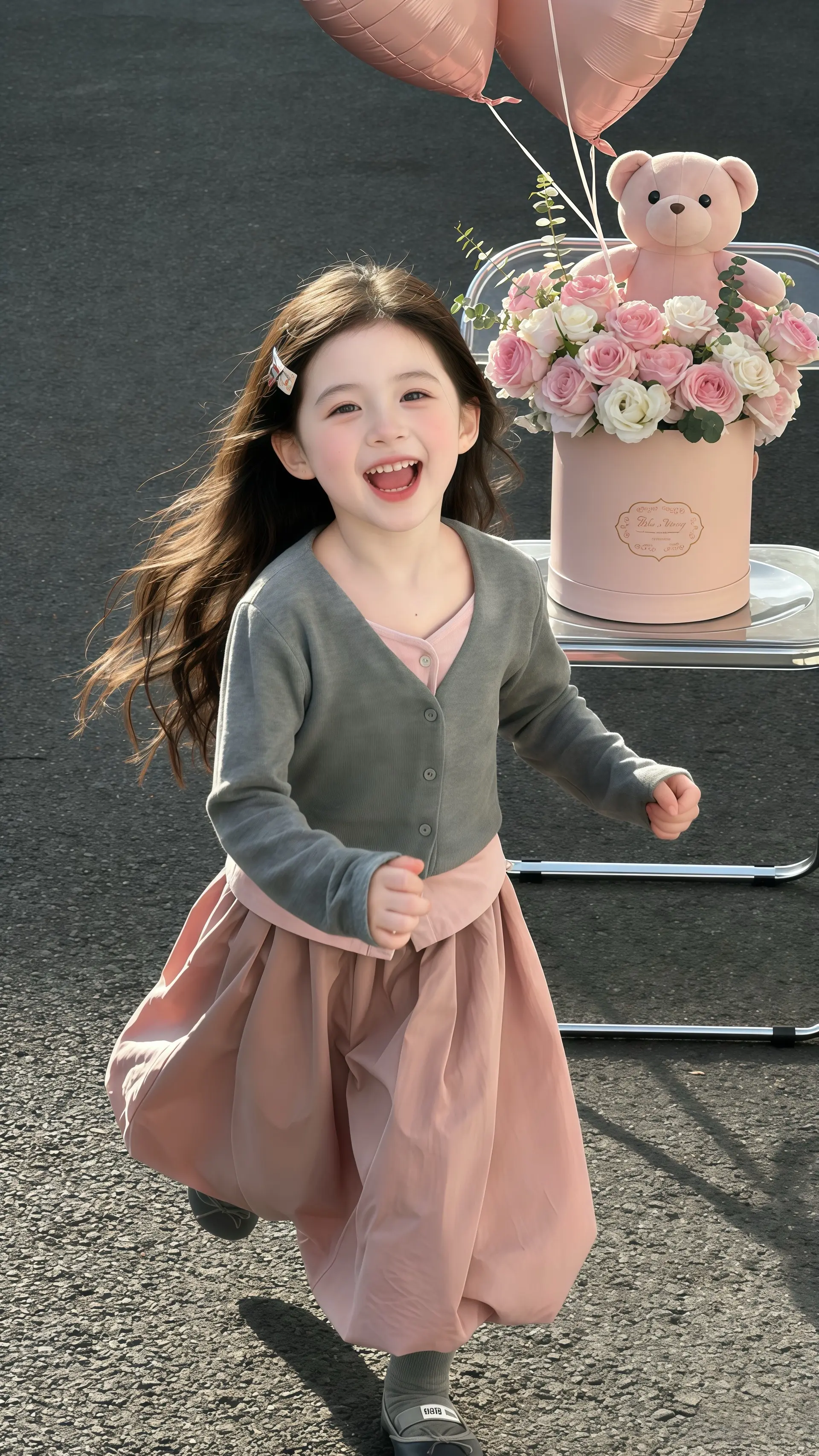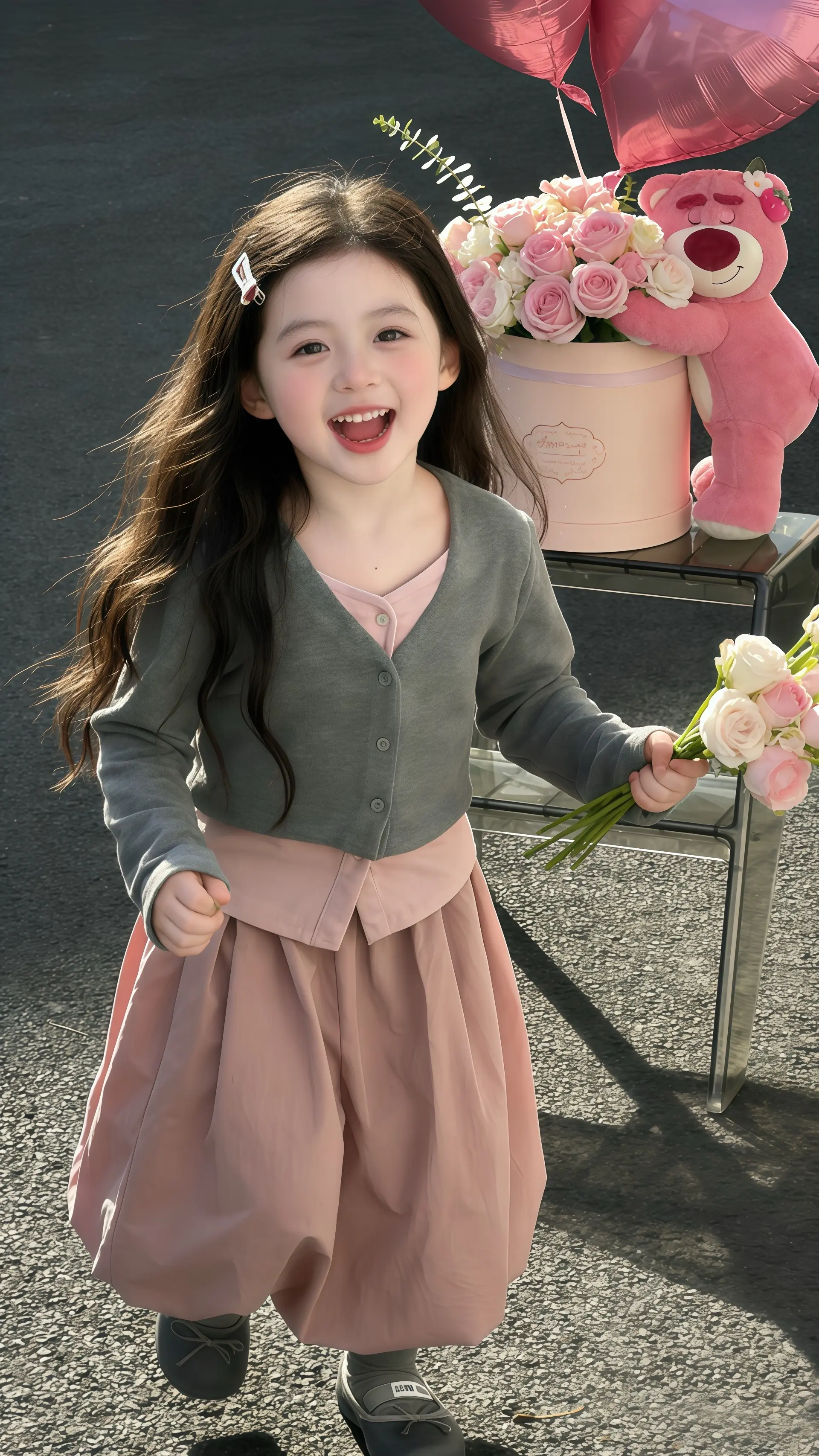 娃弯着腰笑开花,灰开衫软乎乎像“裹了片薄雾”,粉纱裙晃起来像“盛着团樱花云”,灰鞋子亮得像“小奶糕”。妈妈笑着指花桶:“宝宝这一身,像从莫奈画里走出来的小淑女~”娃拽着裙摆晃:“妈妈你看,粉裙子像把春日小温柔都兜住啦,灰开衫还像给春天搭了件小外套,风一吹好像能飘出甜香~爱心气球也像把粉色心跳拎过来啦!”旁边粉花桶、透明椅透着温柔,母女俩和“灰粉套装裹的柔灵气”“花束带的甜福气”,把春日欢喜送到眼前,像把春天酿成了樱花奶茶的香