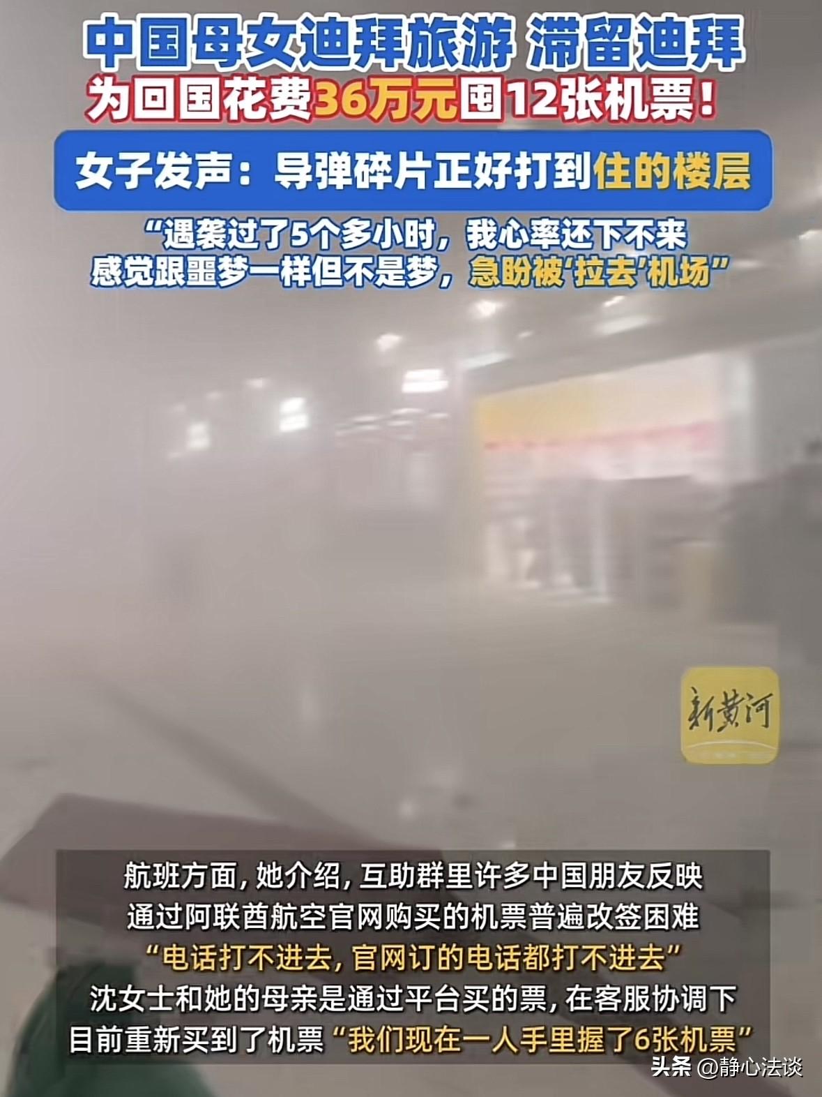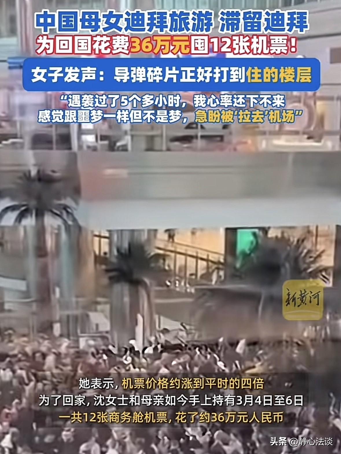 “能花钱解决的事都不是事!”女子带母亲去迪拜旅游,结果赶上那边打仗,而且导弹碎片都打到酒店的楼顶,女子来不及多想,拉着母亲就开始逃,原本她们是要3月7号回国的,她现在只想尽快离开,可当时大多数航班取消,一票难求,普通的机票最少都涨了4倍,她来不及多想,花36万买了3月4-3月6号的12张机票,她目的只有一个,尽快回国,只要平安比什么都强!网友:有时候穷点还是好的,出不了国,只能在国内当牛马! 沈女士趁着不忙,特意带母亲飞迪拜享清福。 原本订好3月7号回国机票,计划着逛完最后几个景点,满载而归。 谁也没料到,意外来得很突然,沈女士和母亲在酒店里躺着,突然传来爆炸声,沈女士赶紧起身查看。 只见外面全是浓烟和人群,导弹碎片还直接砸中了她们住的酒店楼顶。 墙体剧烈震动,玻璃碎片,天花板的碎屑掉的那那都是。 原本号称最安全的土豪城市,瞬间变成了让人提心吊胆的战区。 沈女士来不及多想,抓起护照和钱包拉着母亲,头也不回地往外跑,什么行李什么奢侈品都已经不重要了。 可能是惊吓过度,直到跑到安全区沈女士的腿还一直发抖,心率过快,5个小时都没降下来。 她看着同样惊吓过度的母亲,只有一个想法,要尽快回国。 可当时情况特别混乱,很多航班都取消,回国的机票一票难求。 平时几千块的经济舱,价格直接翻了4倍还抢不到。 有人蹲在机场角落崩溃大哭,有人找遍所有票务中介都没票, 每个人都被远处的爆炸声吓得心惊肉跳,多待一秒都是煎熬。 沈女士没有半点没犹豫,钱在性命面前,根本不值一提。 她盯着手机疯狂刷票,不管航班时间、不管中转次数、不管舱位贵贱,只要能飞就直接下单。 在短短时间内,她一口气花了36万,买下3月4号到6号整整12张机票! 有人说她疯了,买这么多机票太浪费,可她却觉得平安比什么都重要。 能走一张是一张,只要能把母亲平平安安带回家,花多少钱她都愿意。 在等候航班的那几天里,沈女士和母亲几乎是度日如年。 外面稍有一点动静,母女俩的心就揪成一团,神经绷得快要断掉。 原本轻松的旅行时光,此刻被拉得无比漫长,每一分每一秒都像在煎熬。 沈女士在心里一遍又一遍默念、祈祷,只求母女二人能顺顺利利、毫发无伤地回到家。 《民法典》第180条:不可抗力是不能预见、不能避免且不能克服的客观情况,因不可抗力不能履行民事义务的,不承担民事责任。 当地突发战火,航班取消、行程作废,游客无责,有权全额退未消费费用。 而沈女士花36万抢票,属于紧急避险下的自主选择,体现了生命优先的原则。 有人佩服她的果断:生死面前,钱就是一张纸,能换来家人平安,这钱花得太值了。 有人忍不住自嘲:有钱人花36万买机票,我们普通人出不了国,天天在国内当牛马,反倒安安全全躲过一劫! 也有人看得最透彻:我们总羡慕国外的月亮圆,却忘了最珍贵的从来不是奢华的旅行。 而是脚下这片和平的土地,是能随时平安回家的底气。 可这36万,在沈女士看来买的不是机票,是母女俩活下去的希望。 12张机票,锁的不是行程,是女儿绝不丢下母亲的孝心。 而网上五花八门的评论,恰恰照见了每个人截然不同的人生态度与价值观念。 有人信奉金钱万能,有人却把活着本身,当作人生第一要义。 但说到底,在生死面前,一切都是小事,生命永远高于一切,这是永恒不变的底线。 最后,你觉得她花36万抢票,值不值?遇到这种情况,你会怎么做? @静心法谈 学法辨是非,慬法不吃亏。