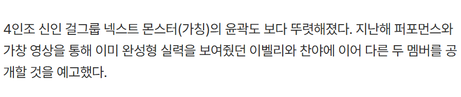 YG 4人组新女团NEXT MONSTER(暂称)的轮廓也逐渐清晰。继去年通过表演和歌唱视频公开的完成型实力的EVELLI 和 CHANYA之后,预告将公开另外两位成员。