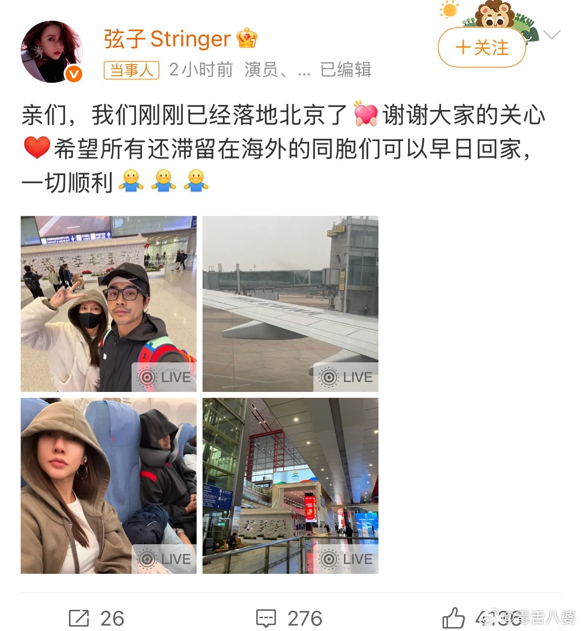 李茂弦子顺利到家 “世界再大,最稳的是回家的路”——看到弦子这句话眼眶湿了。迪拜离战场那么近,带着一大家子人,换谁都得崩溃。还好回来了,希望所有滞留的同胞都能早点平安到家