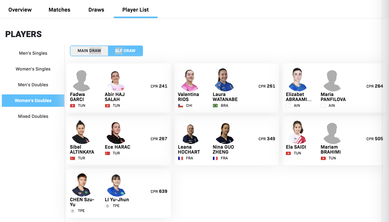 【资格赛】加尔西/萨拉赫🇹🇳、里奥斯🇨🇱/渡边·劳拉🇧🇷、阿布拉米安/潘菲洛娃(AIN)、阿尔廷卡亚/哈拉克🇹🇷、霍查特/郭铮🇫🇷、赛迪/布拉希米🇹🇳、陈思羽/李昱谆(中国台北)