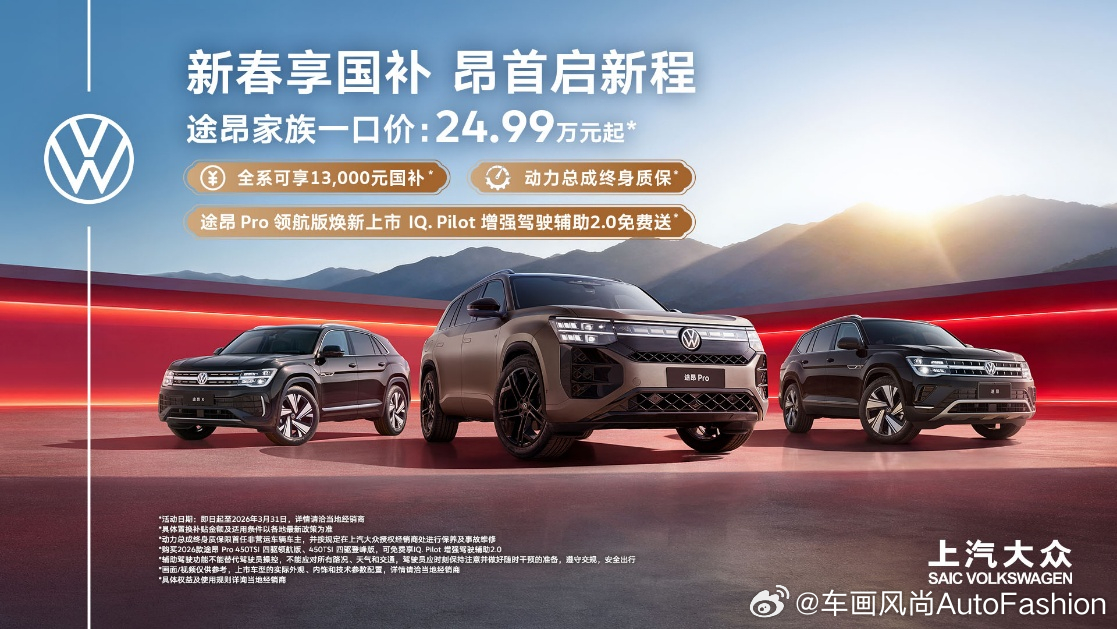新春到来,途昂 Pro也“一键刷新”,3月1日起,途昂 Pro 2026款450TSI四驱领航版焕新上市,惊喜一口价29.99万元起,且增配不加价,现在购买途昂Pro 2026款450TSI四驱领航版和2026款450TSI四驱登峰版,可免费尊享IQ. Pilot增强驾驶辅助2.0,助力用户登峰新年“智”高点。(具体权益、时间及使用规则请详询当地经销商)