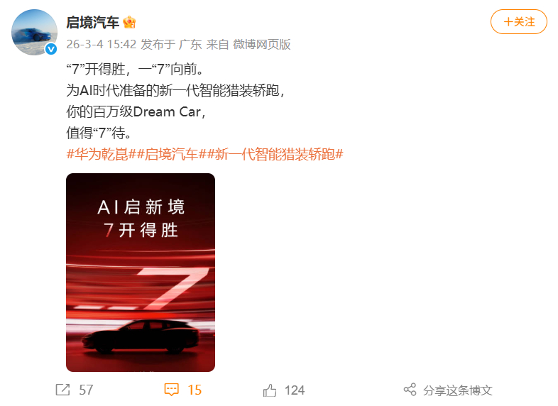 刷到启境“7开得胜”预热海报,正巧今天华为发布会还发布了尚界Z7&Z7T,这几台都属于非常漂亮的轿跑车型。启境在这个节点官宣新品,同样以“7”命名,能看出其大概的市场定位。