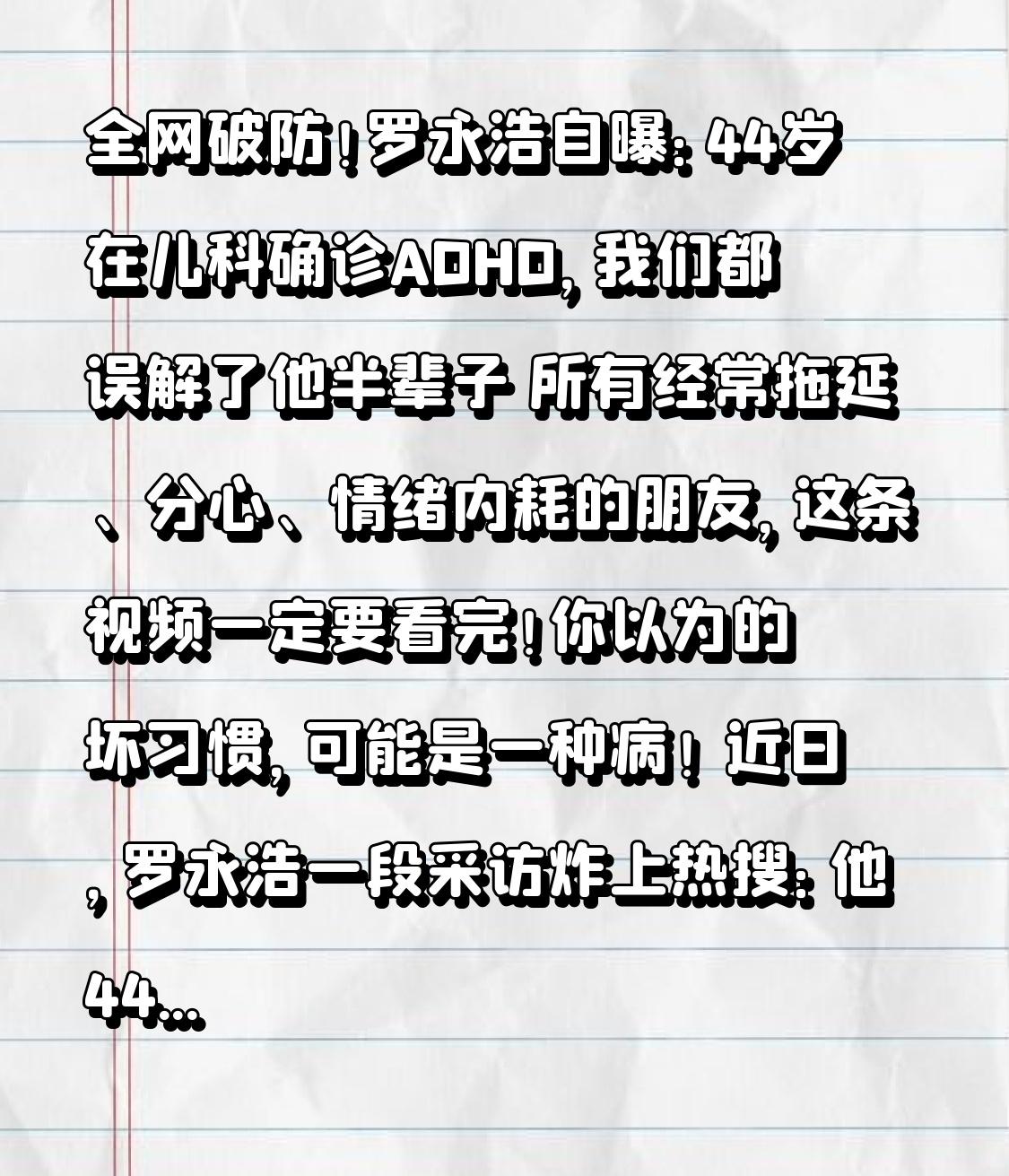 全网破防!罗永浩自曝:44岁在儿科确诊ADHD,我们都误解了他半辈子 所有经常拖延、分心、情绪内耗的朋友,这条视频一定要看完!你以为的坏习惯,可能是一种病! 近日,罗永浩一段采访炸上热搜:他44岁那年,在儿科确诊ADHD(注意缺陷多动障碍)。候诊大厅全是小朋友,只有他一个中年男人,尴尬到只能假装是陪孩子看病的爸爸,叫号后赶紧冲进诊室,生怕被人围观。 很多人第一反应:罗永浩那么厉害,怎么会得多动症? 大错特错!ADHD不是小孩专属,更不是“调皮捣蛋”。罗永浩坦言,自己被这个病困扰了几十年:注意力难集中、做事拖延、情绪冲动、发布会从不彩排、PPT永远赶在最后一秒,全靠体力、经验和药物硬撑。 他吃药十几年,如今剂量吃到最大,效果越来越差,熬夜两三天心脏就难受。之前公开活动迟到40分钟,他没有找借口,而是坦诚自己被ADHD困扰,这不是态度问题,是大脑控制不住。 真正的转折点来了! 过去我们总骂:这人懒、不靠谱、没毅力、脾气差。 现在才懂:ADHD是神经发育障碍,不是品行问题,更不是懒! 国内成人ADHD诊疗几乎空白,大医院也没有成人专科,成年人想确诊,只能混进儿科。无数人从小被误解、被指责,长大自我否定、焦虑内耗,直到中年才知道:原来我不是坏,是病了。 罗永浩的自曝,撕开了千万成人ADHD的遮羞布。 他们不是不努力,是大脑很难专注;不是不想靠谱,是时间管理天生困难;不是情绪暴躁,是神经太敏感。 这个世界最残忍的,就是用普通人的标准,去要求一个生病的人。 罗永浩在如此困境下,还能做成那么多大事,已经拼尽了全力。 愿我们少一点指责,多一点理解;少一点标签,多一点包容。 如果你也经常拖延、分心、坐不住、情绪波动大,别再自我攻击,你可能只是需要被看见、被科学帮助。 人生不是比赛,不必逼自己和别人一样。接纳自己,好好爱自己,就是最好的解药。 理解ADHD群体的,点赞转发,让更多人放下偏见,温柔以待!