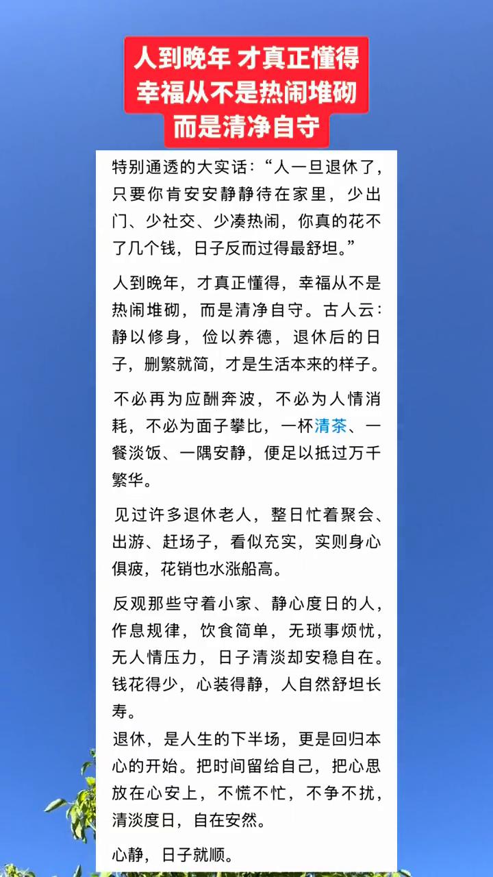 人到晚年才真正懂得,幸福从不是热闹堆砌,而是清净自守。 特别通透的大实话:"人一旦退休了,只要你肯安安静静待在家里,少出门、少社交、少凑热闹,你真的花不了几个钱,日子反而过得最舒坦。" 人到晚年才真正懂得,幸福从不是热闹堆砌,而是清净自守。古人云:静以修身,俭以养德。退休后的日子,删繁就简,才是生活本来的样子。不必再为应酬奔波,不必为人情消耗,不必为面子攀比,一杯清茶、一餐淡饭、一隅安静,便足以抵过万千繁华。 见过许多退休老人,整日忙着聚会、出游、赶场子,看似充实,实则身心俱疲,花销也水涨船高。反观那些守着小家、静心度日的人,作息规律,饮食简单,无琐事烦忧,无人情压力,日子清淡却安稳自在。钱花得少,心装得静,人自然舒坦长寿。 退休是人生的下半场,更是回归本心的开始。把时间留给自己,把心思放在心安上,不慌不忙,不争不扰,清淡度日,自在安然。心静,日子就顺。