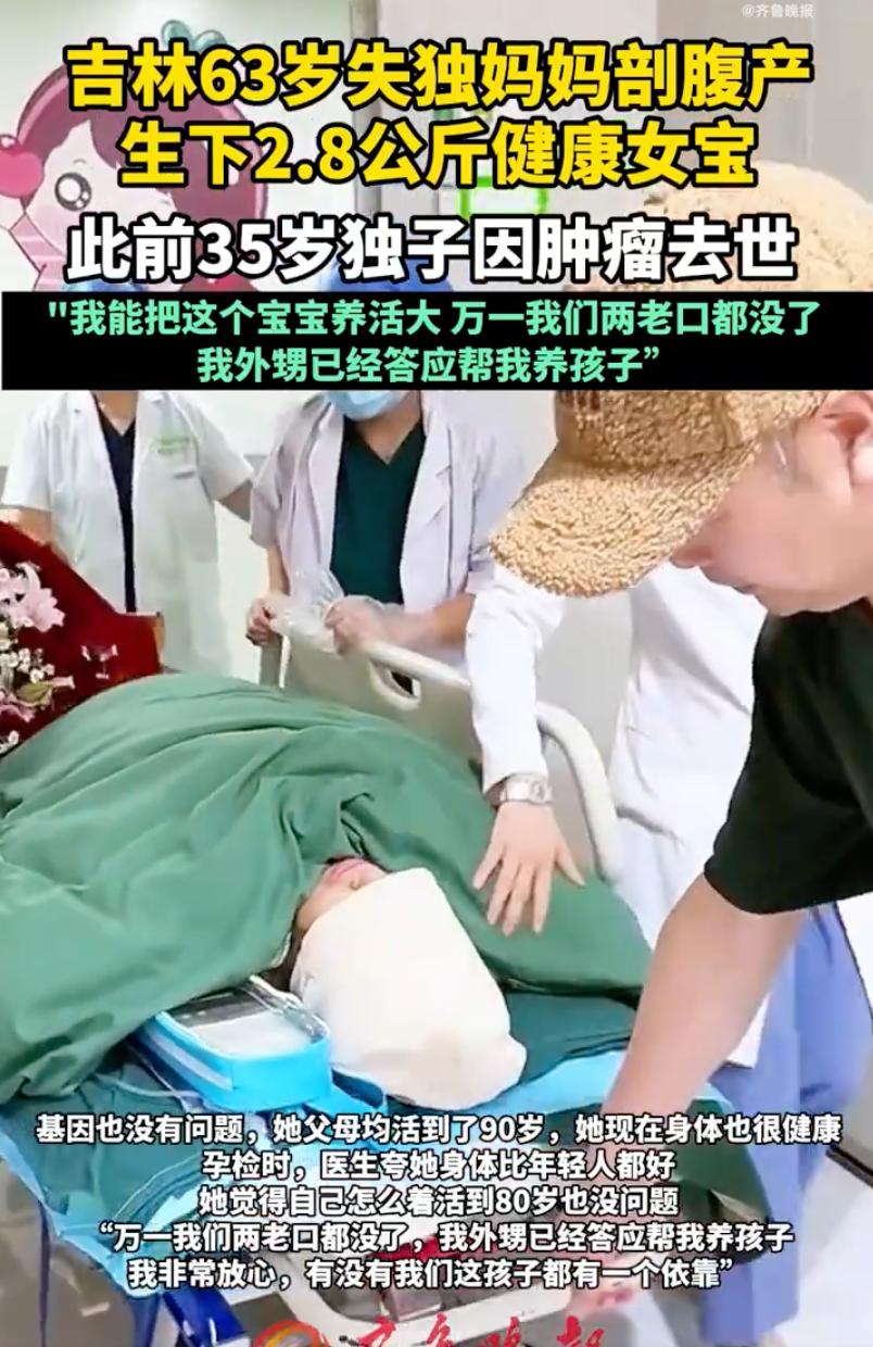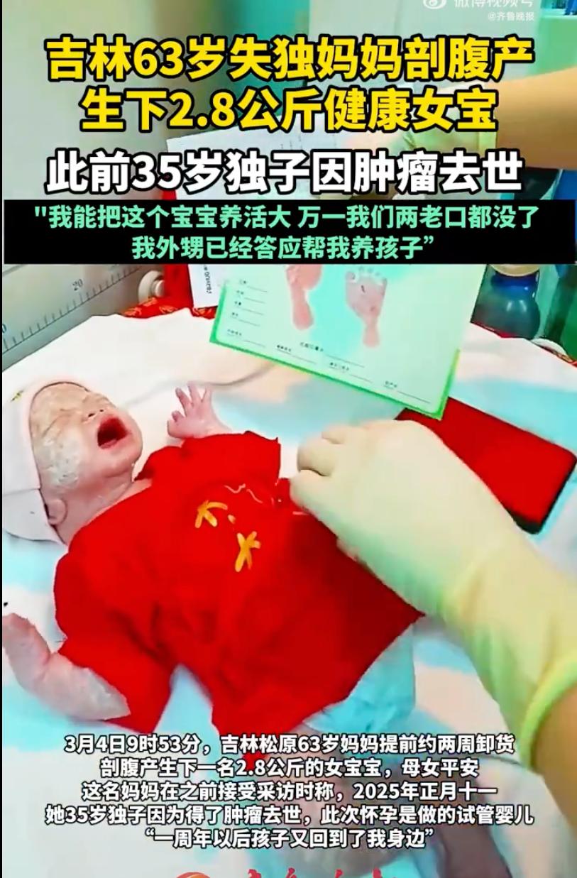 破防了!吉林松原,一位63岁的阿姨,硬是生个5.6斤的女儿,这岁数本来是领着孙子遛弯的,没成想人家自己又当了妈,网友:以后孩子怎么办! 据媒体说,当时全院上下都盯着这台手术,哪怕是见惯了大场面的大夫,心里也都在打鼓,毕竟这岁数生孩子太危险,好在母女平安,阿姨在产房里一直挺乐观,说她没啥感觉就把孩子生出来了。 这位阿姨领着退休金,顺带着做点生意,本来日子过得挺好,哪知道去年正月十一那天,35岁的儿子因为得肿瘤去世,老两口的天塌了,天天躲在屋里各待各的,连个说话的人都没有,只要一打照面,瞅见对方那副失魂落魄的样子就不敢掉眼泪,心里憋屈得生不如死。 她寻思着要是不要这个孩子,这辈子就彻底活不下去了,哪怕家里亲戚没一个支持的,连在医院干活的外甥都说危险太大,她还是拼了命也要再生一个,她总觉得自家孩子指定能回来。 为了这个念想,她先是去了趟外地做试管,就算有闲言碎语,她还是怀上了孕。在孕检时,大夫看着她的报告都直纳闷,说她这身子骨硬朗,比年轻的小姑娘都要好,自己也觉得浑身有使不完的劲儿,自从肚子里有了动静,心一下子就敞亮了,每天都盼着见面。 3月4号,随着产房里的一声啼哭,这悬了一年的心总算落了地,完事儿后看着怀里软糯的小闺女,阿姨眼圈红了,她说啥都行,上天给了一个就行,那一刻她觉得日子终于有了盼头,觉得儿子走了一周年,现在是换了个样儿又回来了。 消息传开,网上的评论区里说什么的都有,有人说后代非得要吗,以后孩子上学别人肯定得管妈叫奶奶,这童年不得自卑死。 还有人觉得谁也代替不了谁,老二不过是老大的替身,以后家里动不动就得提老大,对孩子实在是有点不公平。 其实说白了,自卑不自卑全是家里人教出来的,没遇到好的引导,个子高矮、身材胖瘦都能让人自卑,只要大人不乱讲,孩子未必过得不舒心,更何况现在高龄生娃的也不在少数。 这阿姨收入还可以,手每个月进账一万多,家里父母都活到九十多岁,这长寿劲儿是祖传的,她觉得自己活到80岁没问题,就算万一两口子走在前头了,外甥也拍了胸脯,说以后就把这娃当亲生的拉扯大,肯定有个依靠。 这分明是失独家庭被困久了才求来的一个执念,咱外人真懂不了,既然娘俩都平安,咱就多点尊重和理解,希望她们一直幸福。
