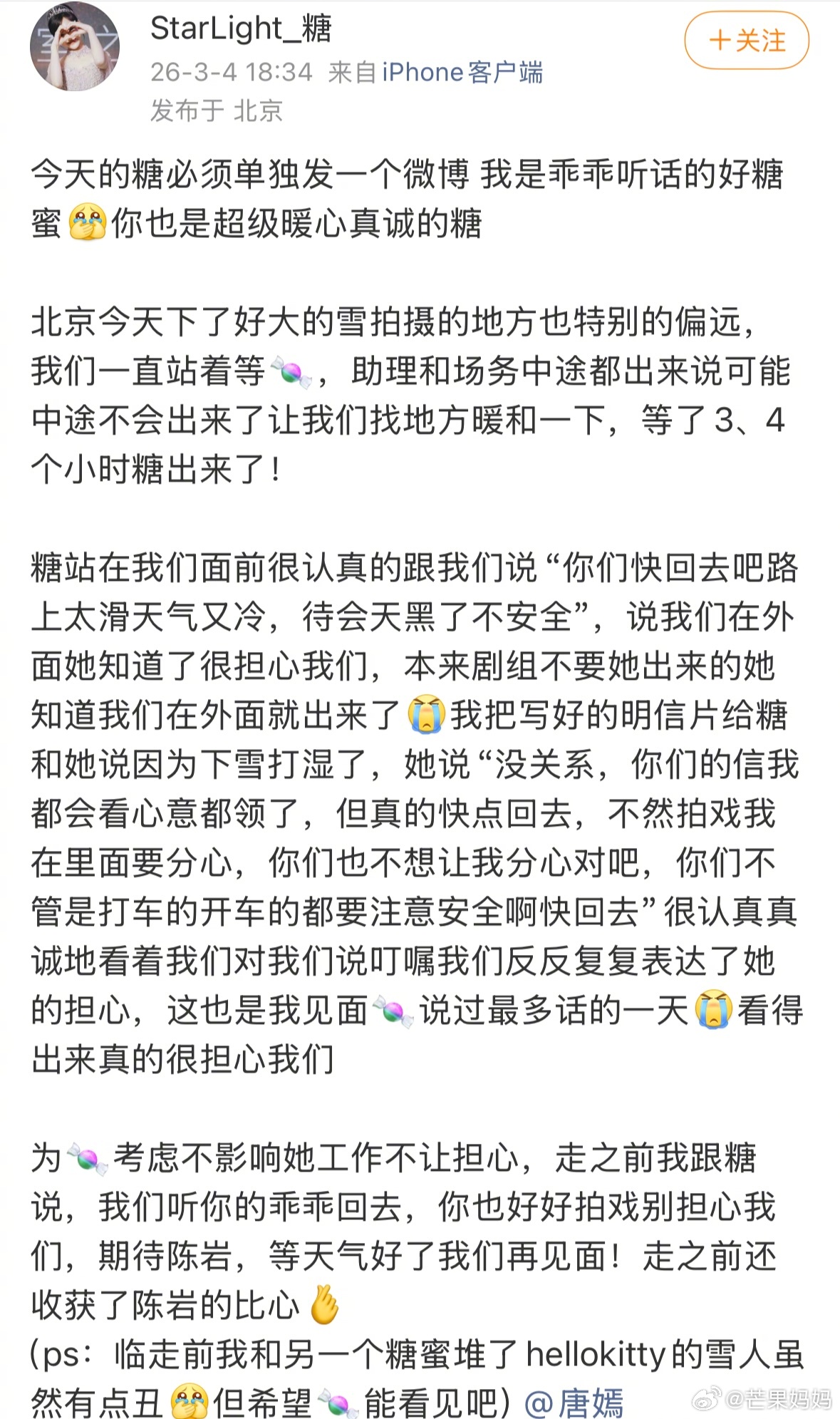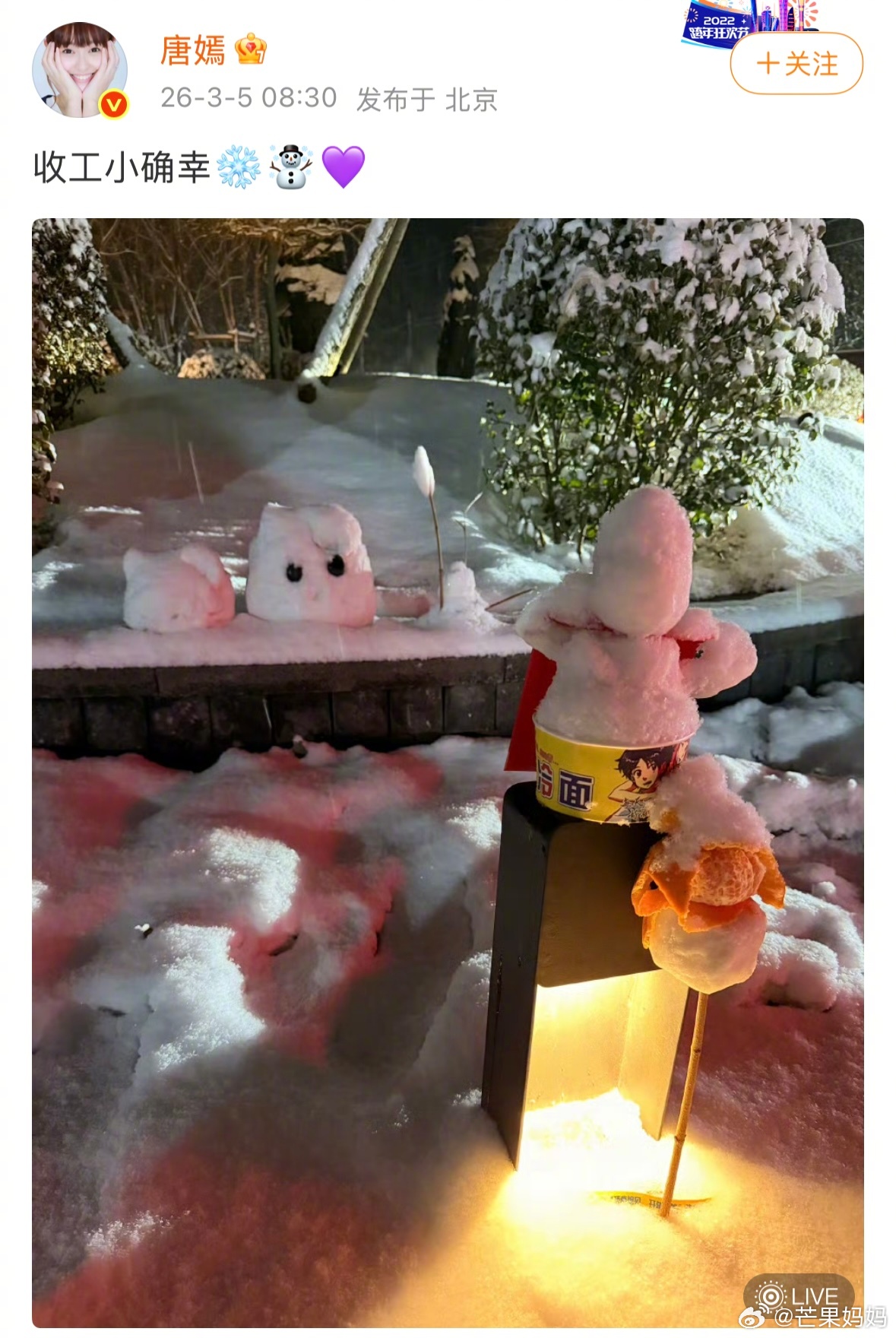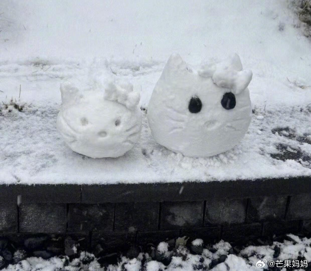 唐嫣收工拍到了粉丝给她堆的kitty小雪人,反复叮嘱粉丝早点回家,粉丝下雪天在外面她拍戏会担心会分心,太宠了这个🍬 唐嫣收工拍的雪人