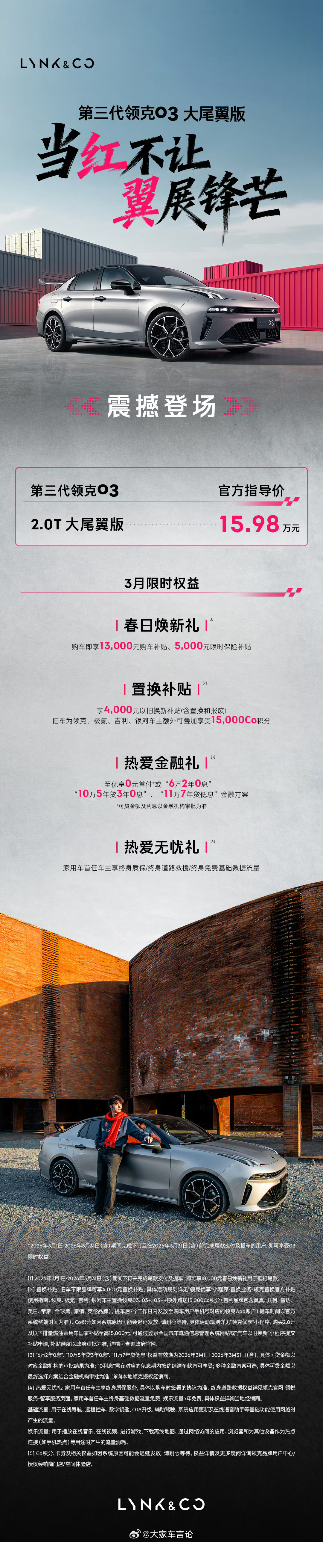 不久前厉害的网友路遇的大尾翼成真了。第三代领克03大尾翼版登场,售价15.98万元。