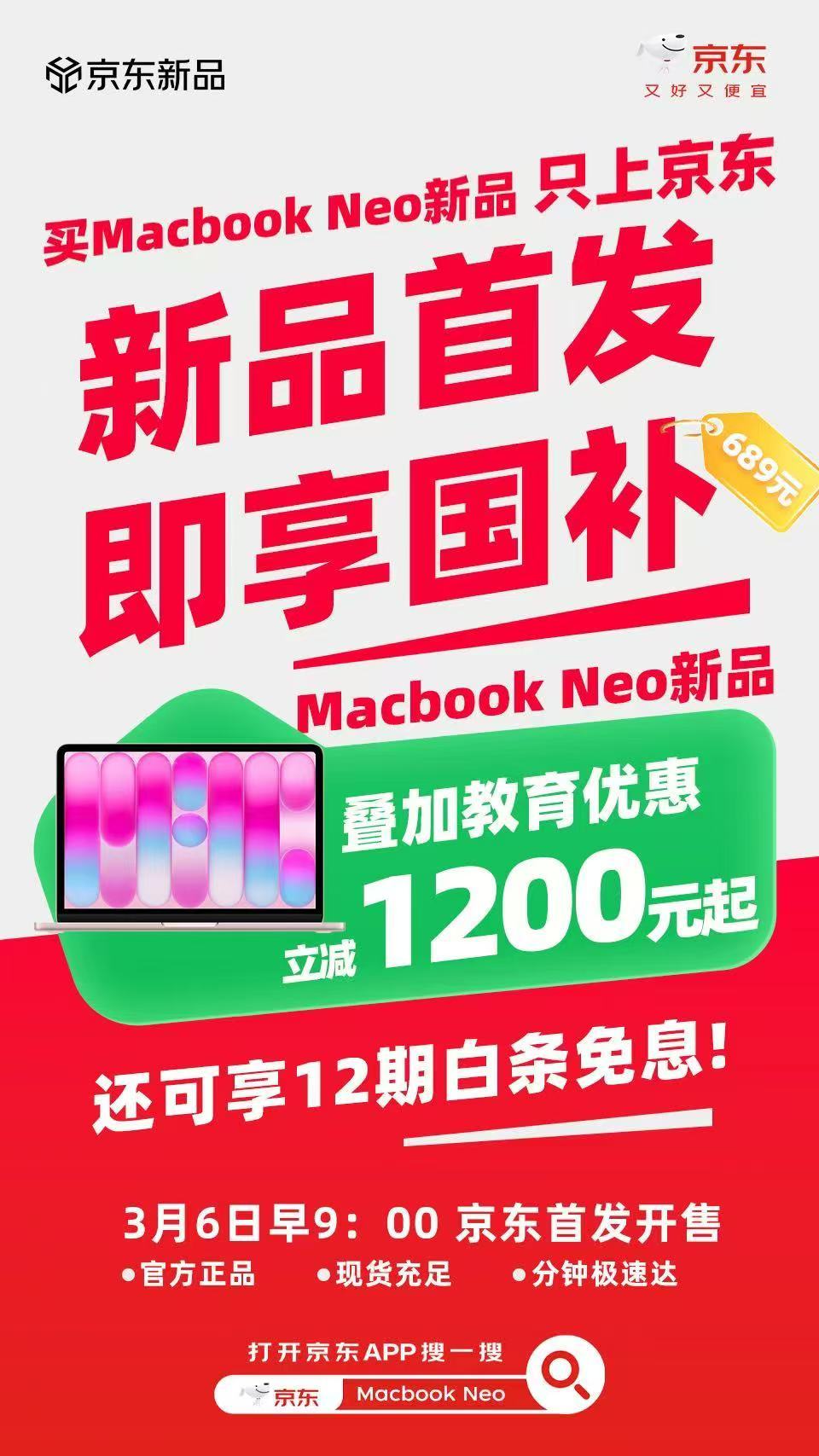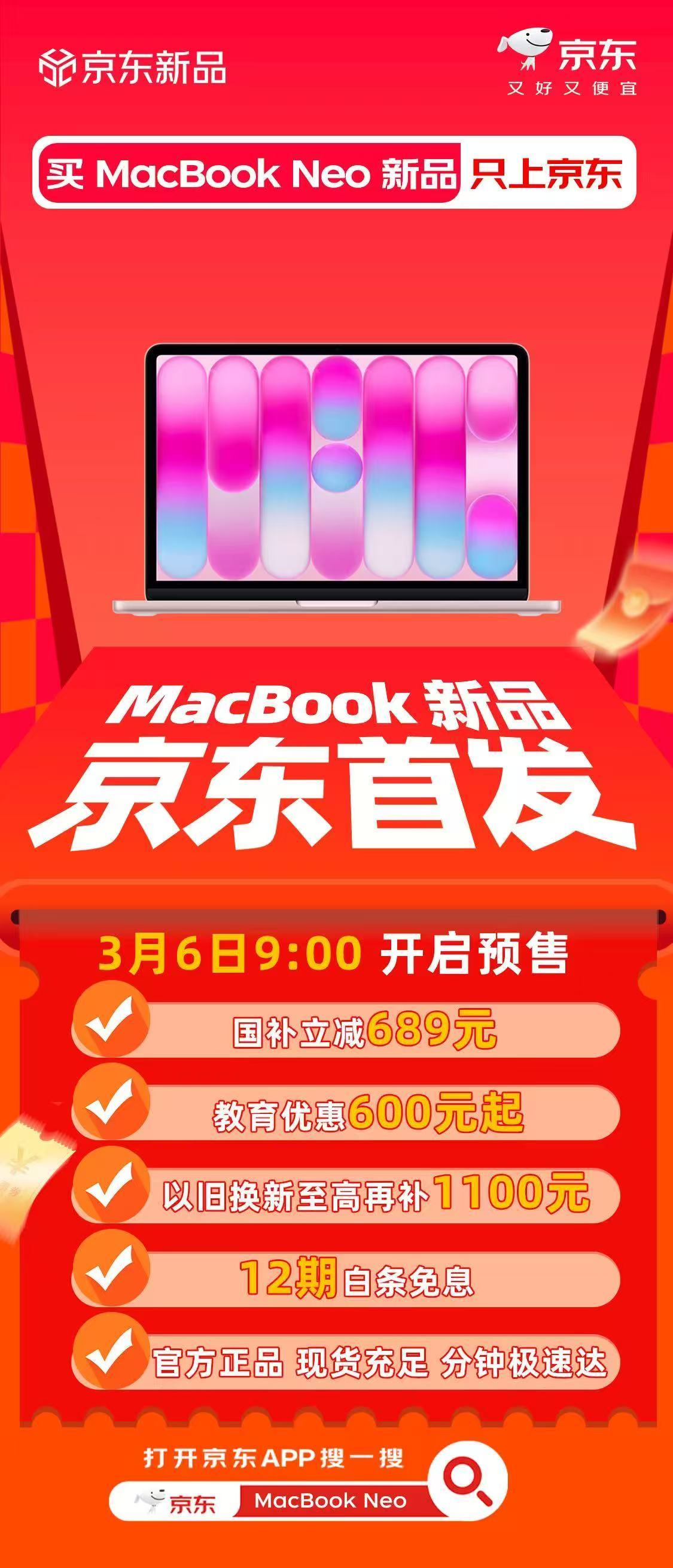 neo是定位卖给国外中学生的 3月4日苹果发布MacBook Neo,起售价4599元,叠加国补与教育优惠后低至3399元,为苹果史上最亲民笔记本。搭载A18 Pro芯片与13英寸屏,浅黄/粉/蓝/绿四色可选,精准面向学生与年轻职场人,有望成开学标配。