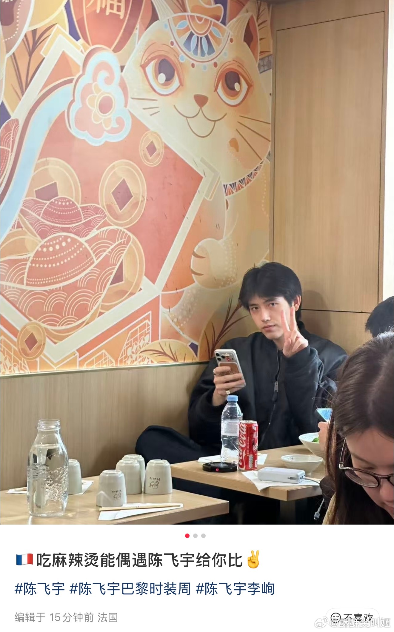 网友法国偶遇陈飞宇吃麻辣烫看见她举起手机,不但大大方方看镜头了,还给她比了个剪刀手✌🏻啊啊啊啊啊啊啊啊啊心理委员呢!!!这个阿瑟怎么这么好,我要闹了!!什么时候轮到我偶遇!!!(这家麻辣烫到底有多好吃,完全是阿瑟诱捕器!!!)(新增IG Story更新2P)陈飞宇陈飞宇巴黎时装周