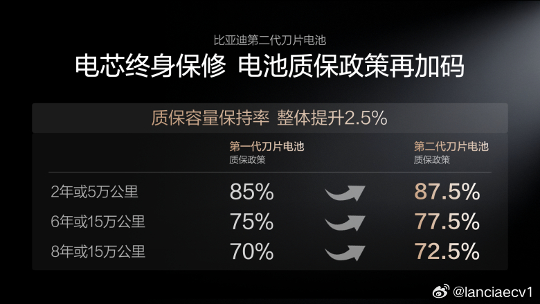 第二代刀片电池通过打造“锂离子高速通道”和“全温域智能热管理系统”,实现了更低的产热和更高效、均匀的散热,让闪充对电池寿命几乎没有影响。基于这样的底气,比亚迪还宣布电池质保政策再加码!第二代刀片电池质保的“容量保持率”整体提升2.5%,电芯依旧是“终身保修”,这就是第二代刀片电池,给所有用户的安心承诺。