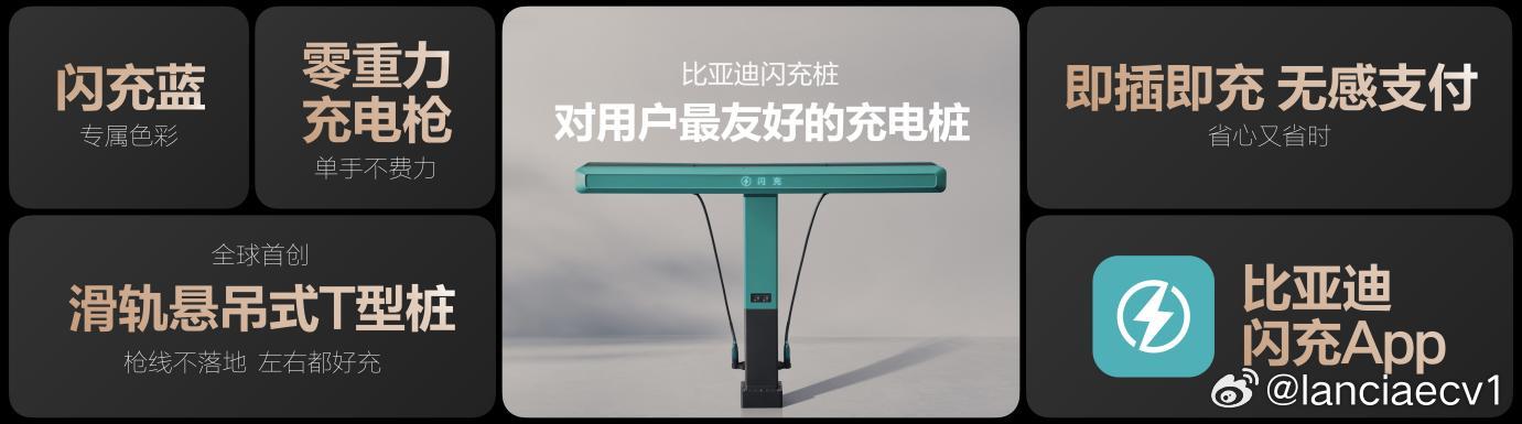 发布“闪充中国”战略,让闪充体验随处可及传统公共充电桩枪重、线脏、移动不灵活,充电流程还很繁琐,为了解决这些痛点,比亚迪闪充桩采用了全球首创的“滑轨悬吊式T型桩”设计,让线拉着枪,手感非常轻巧,几乎是“零重力充电枪”;并且,枪线永远保持悬空,避免缠绕更干净;还可以让用户轻松左右滑动,充电更灵活。同时,比亚迪还打通了车和桩之间的所有链路,只需通过比亚迪闪充APP简单设置,即可实现“即插即充,无感支付”,这就是对用户最友好的充电桩。