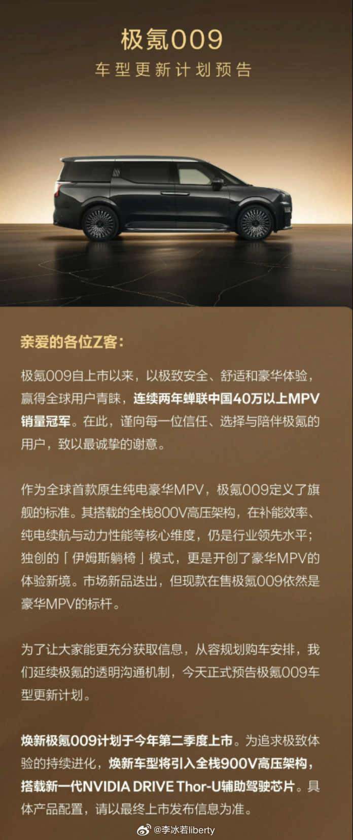 新的极氪009有消息了官方说是26年2季度上关于更新的内容肯定不是大改包含900V 高压架构+英伟达 Thor-U 芯片另外btw传了很久还有一台插混 MPV(白鲸)极氪009新能源大牛说