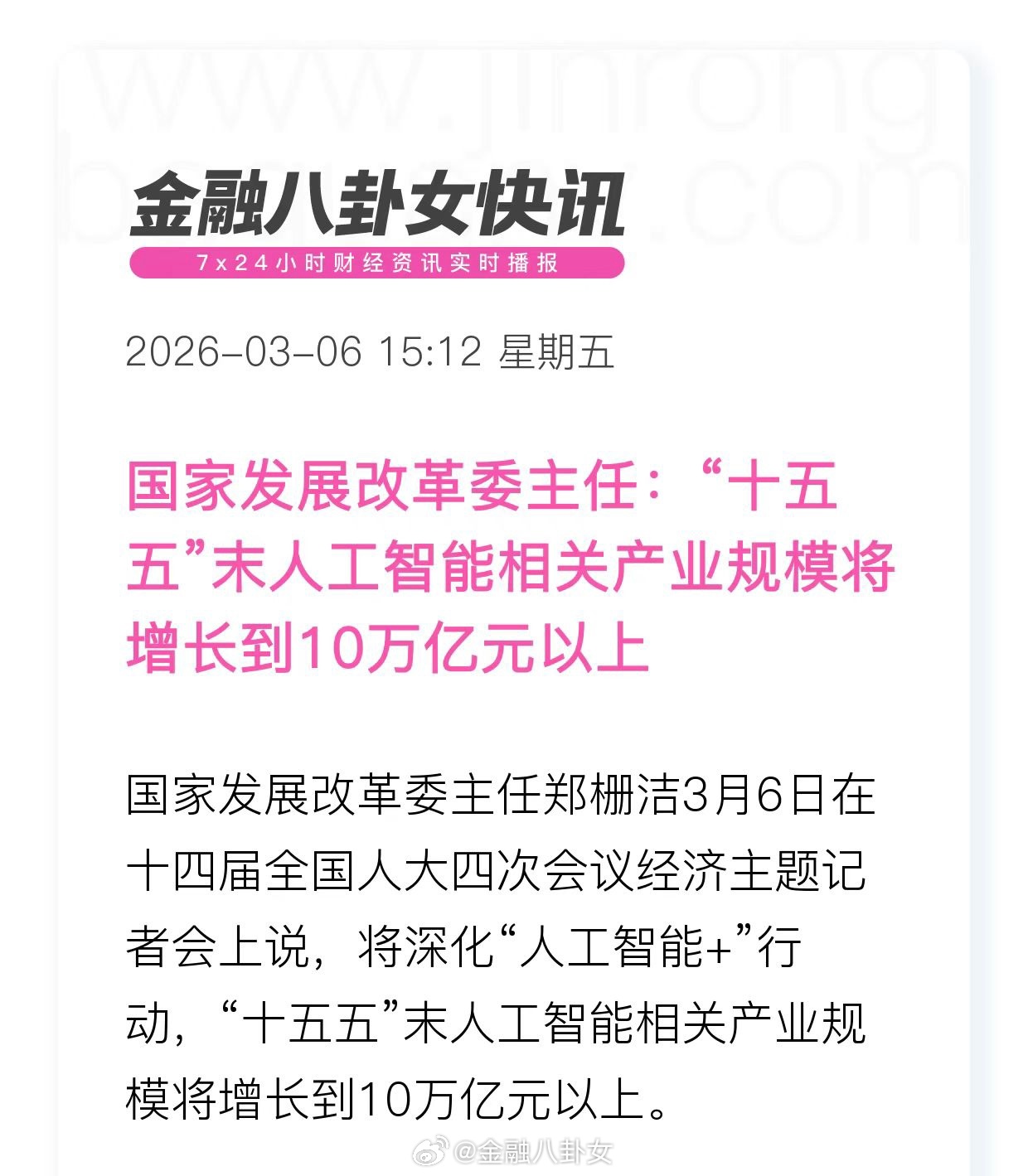 国家发展改革委主任:安排更多的政策和资金 更好地释放消费潜力。“十五五”末人工智能相关产业规模将增长到10万亿元以上。