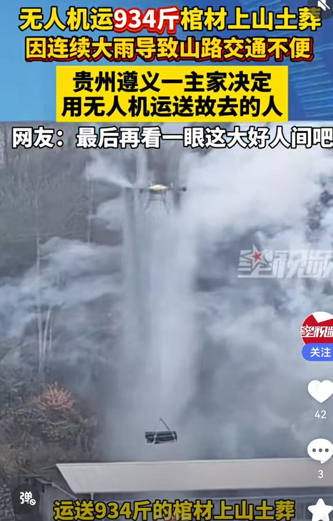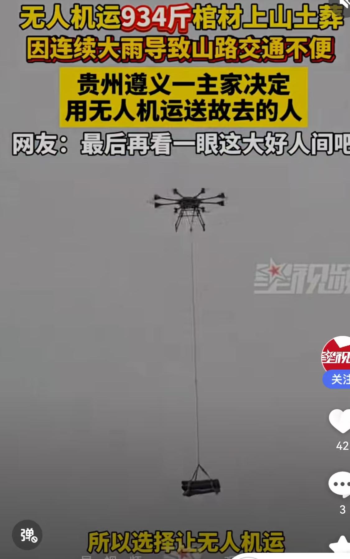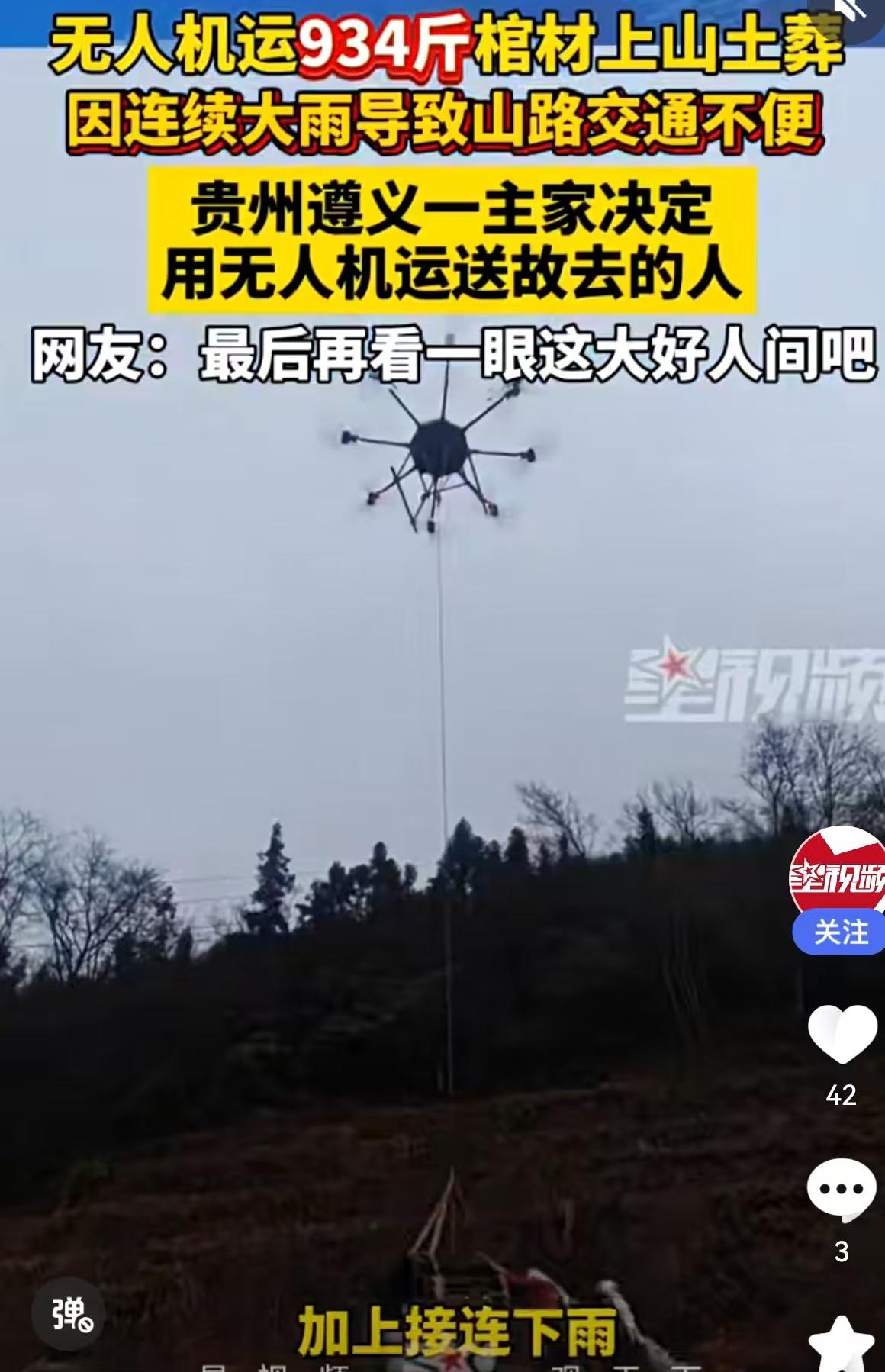 这几天,一段发生在贵州遵义的视频在朋友圈里刷了屏,看得人是目瞪口呆,紧接着心里又是一阵感慨。 画面里,深山密林间,一具沉重的棺材被几根粗壮的绳索牢牢固定,缓缓升空。这可不是什么电影特效,而是真实的农村白事现场。这具棺材重达934斤,硬是被一架工业级无人机给“提”了起来,稳稳当当地飞向了半山腰的墓地。这事发生在贵州遵义的农村,发布者“观象视频”也在2天前确认了这一消息。 咱们先聊聊为什么要这么大动干戈。办白事的主家也是无奈之举。贵州那边山多地少,这墓地选在山上,偏偏最近接连下雨,山路泥泞不堪,湿滑难行。这要是靠人力抬,934斤的重量,加上陡峭的滑坡,那简直就是拿命在拼。以前咱们常说“棺材本”,那是钱的问题;现在这情况,没点硬核科技,连“上山”这关都难过。主家坦言,有的地方人力根本去不了,才不得不租用了无人机配送。这一送,送出了个“硬核殡葬”,也送出了农村变迁的新课题。 这事儿一出,评论区立马炸开了锅。有网友调侃说这是“坐飞机升天”,也有网友发出了灵魂拷问:“现在都是火葬还需要用棺材?”“不是只能火化,不给土葬了吗?”这问题问到了点子上,也反映了咱们国家幅员辽阔,各地风俗和政策执行上的差异。 咱们得客观地看这事。虽然国家大力推行火葬,但在很多偏远农村、山区,受限于传统观念“入土为安”,土葬依然有它的生存空间。特别是像贵州这种地形复杂的地区,殡葬改革的推进是一方面,但如何在尊重传统和遵守法规之间找到平衡点,是个现实难题。视频里这具934斤的棺材,显然是土葬的规格。这背后,是政策落实的“最后一公里”,也是传统习俗在现代社会里的顽强挣扎。 再看网友好奇的“什么棺材900斤”。这其实不稀奇。在南方很多农村,棺材那是大事,选木料讲究厚实,柏木、杉木那是起步,有的甚至要用整根圆木掏空。这种实木“大家伙”,分量轻的三五百斤,重的上千斤都有。以前那是靠家族里壮劳力多,几十个人轮流换班抬;现在农村空心化严重,年轻人都出去打工了,留守的老人孩子,谁抬得动?这不仅是重量的问题,更是人力缺失的现实。 这就引出了无人机送棺材背后的深层逻辑:科技正在填补传统社会结构变化留下的空缺。以前办白事,那是家族凝聚力的大考,人丁兴旺才能风风光光把老人送走。现在呢?人凑不齐了,路不好走了,但事儿还得办。这时候,工业级无人机登场了。它能吊起近千斤的重物,不受地形限制,这不仅仅是图省事,更是为了安全。要是抬棺材的过程中,谁脚下一滑出了意外,那白事变红事,主家心里更过不去。 这934斤的棺材上天,看似荒诞,实则心酸又务实。它让我们看到了科技下乡的另一面——不只是用来喷洒农药、测绘地形,还能用来解决人生大事的痛点。这也给咱们提了个醒:在推行移风易俗的同时,也得关注农村基础设施的建设。如果路修通了,车能开上去,谁又愿意花大价钱租无人机来冒险呢? 当然,对于网友质疑的“违规土葬”问题,当地相关部门肯定会有相应的监管措施。但站在当事家庭的角度,在那样一个风雨交加、山路难行的时刻,他们做出的选择,或许是在现有条件下,对逝者最大的尊重和对生者最大的保护。 这一幕“棺材飞天”,既是传统习俗在现代化浪潮中的一次“借力打力”,也是农村生活变迁的一个缩影。科技在进步,观念在更新,但那份想让亲人走得体面的心意,无论用什么方式运载,都是沉甸甸的。咱们在看热闹之余,也不妨多一份理解,少一份苛责。毕竟,生活里的无奈,有时候比这934斤的棺材还要重。 以上内容仅供参考和借鉴