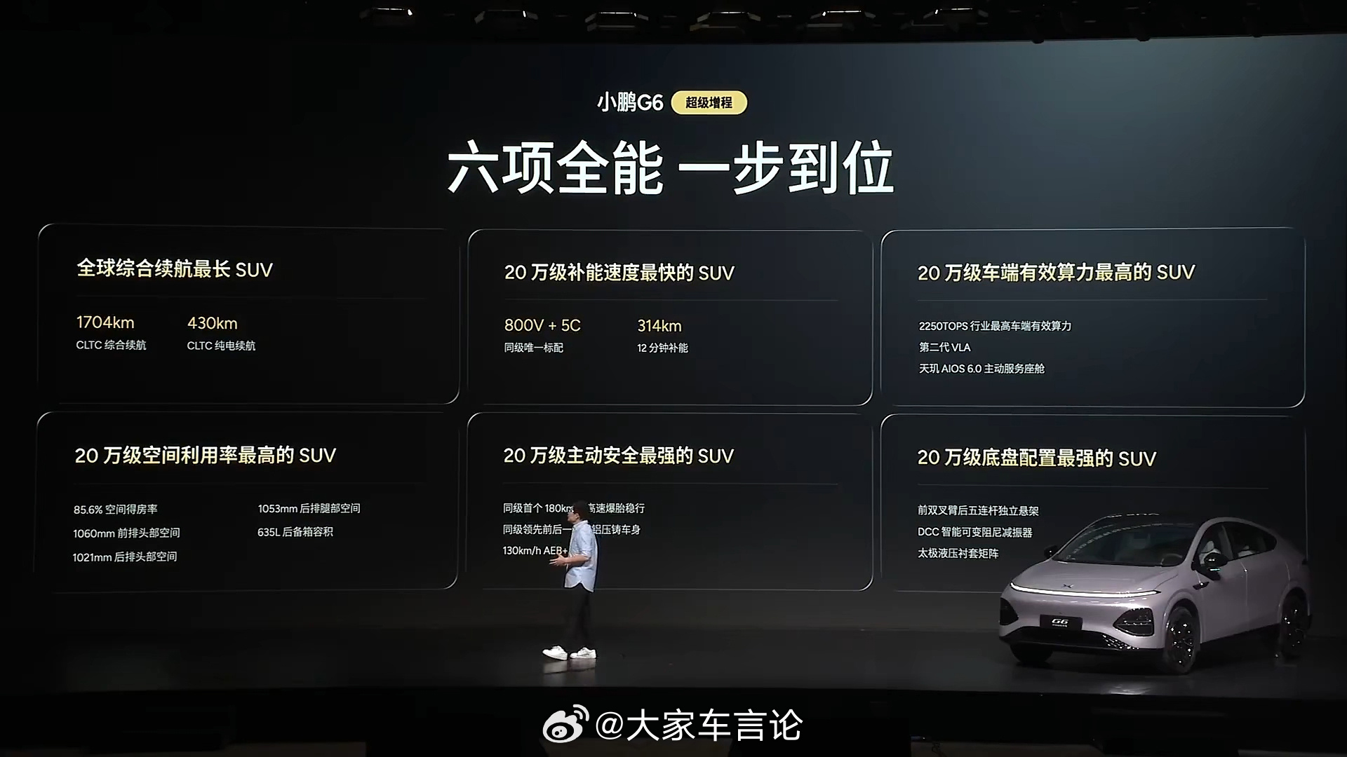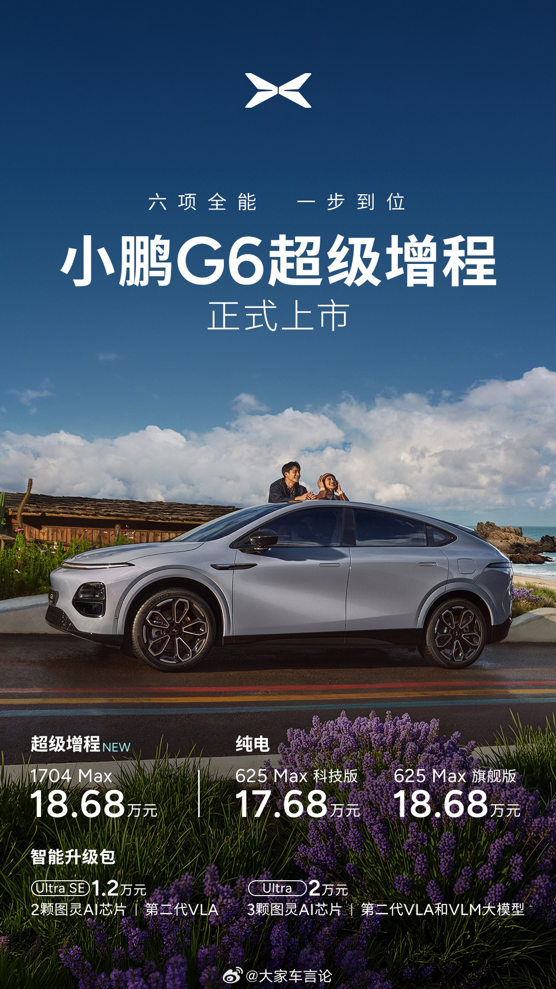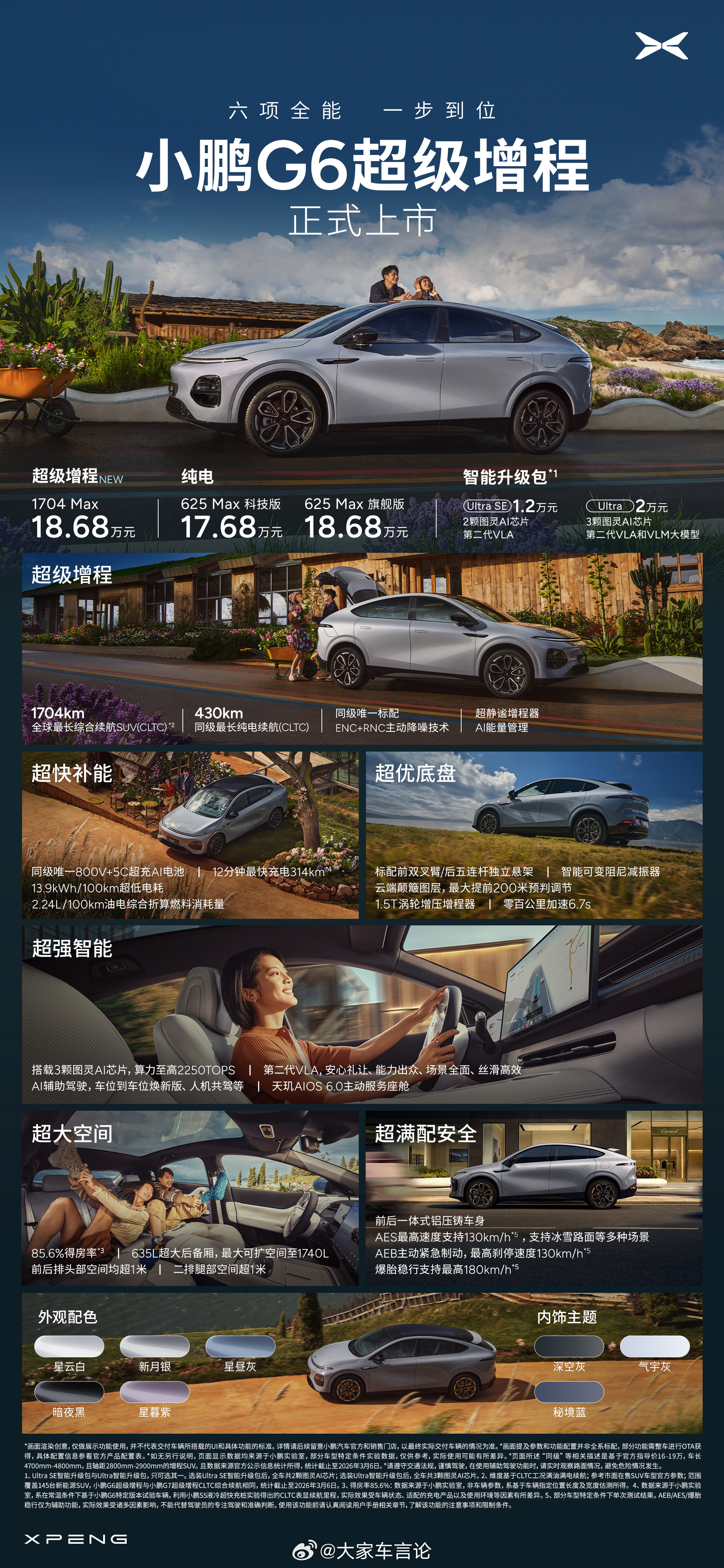小鹏G6超级增程价格公布 18.68万起售。全系标配800V高压平台和5C超充,可加钱选装图灵芯片 Ultra SE 加1.2万、Ultra 加2万。 新增智能可变阻尼减振并升级太极液压衬套矩阵;CLTC纯电续航430km,综合续航1704km。