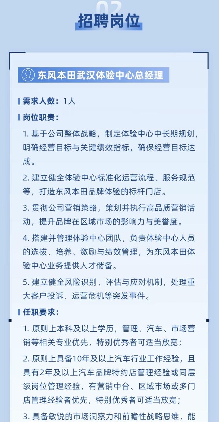 东风本田招聘总经理 近日,东风本田汽车有限公司发布招聘信息,招聘岗位为总经理,这是闷声干大事呀。小编从内部渠道了解到,东风本田自营的武汉体验中心马上就要营业啦,本次是给体验中心招聘总经理,作为曾经的燃油时代王者,现在要对齐新势力啦。相信武汉体验中心开业之日,就是东风本田再造辉煌之时。