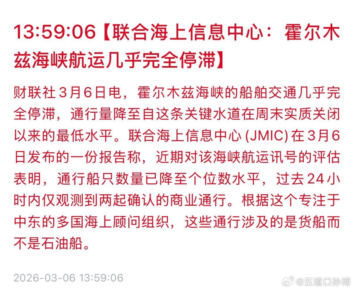 联合海上信息中心( JMIC )在3月6日发布的一份报告称,近期对该海峡航运讯号的评估表明,通行船只数量已降至个位数水平,过去24小时内仅观测到两起确认的商业通行。根据这个专注于中东的多国海上顾问组织,这些通行涉及的是货船而不是石油船。