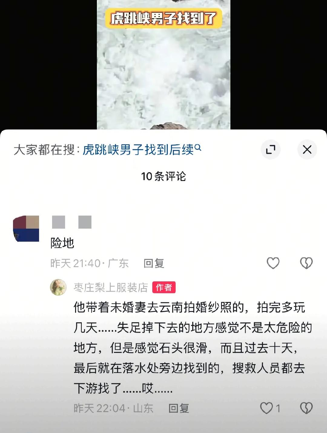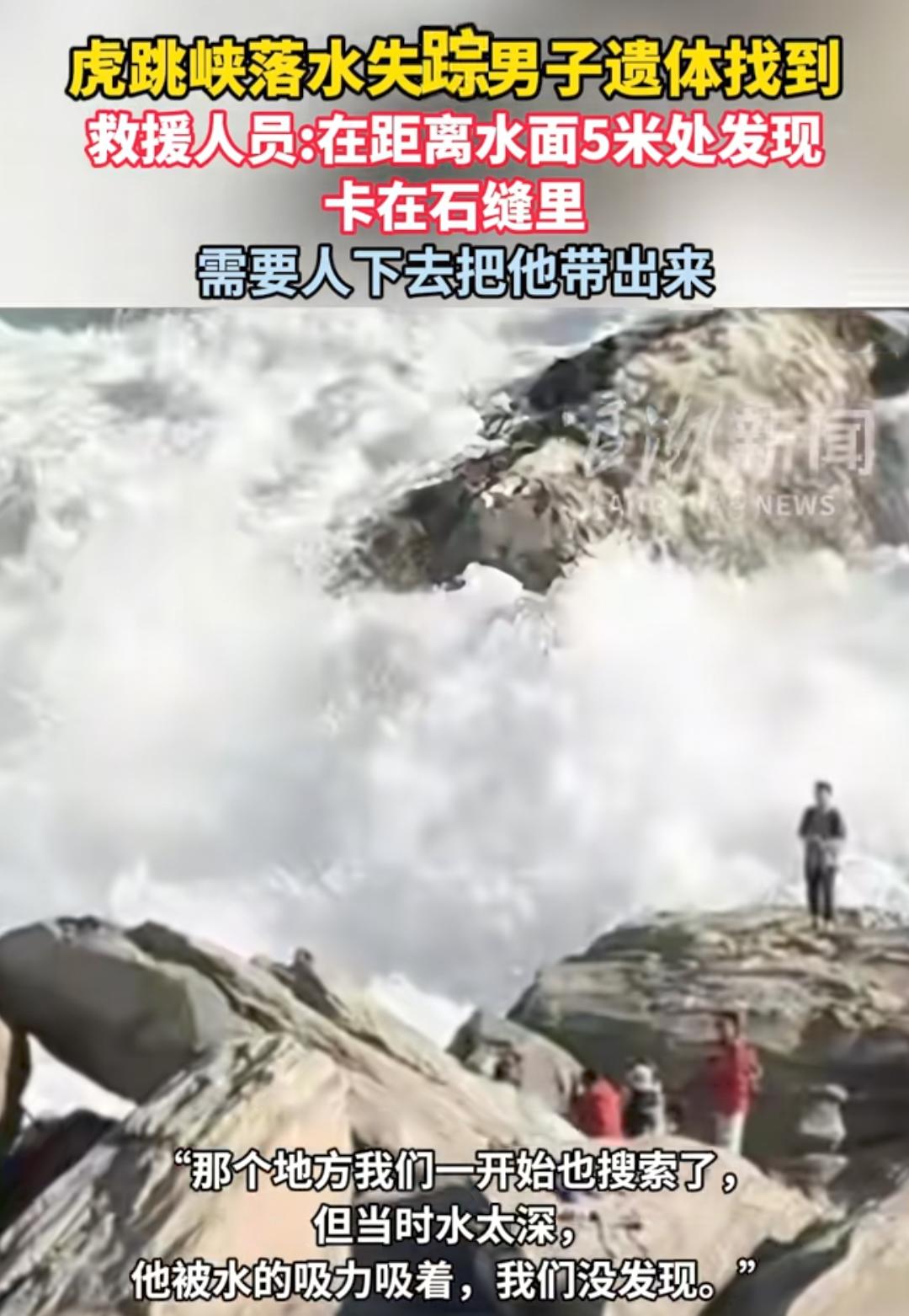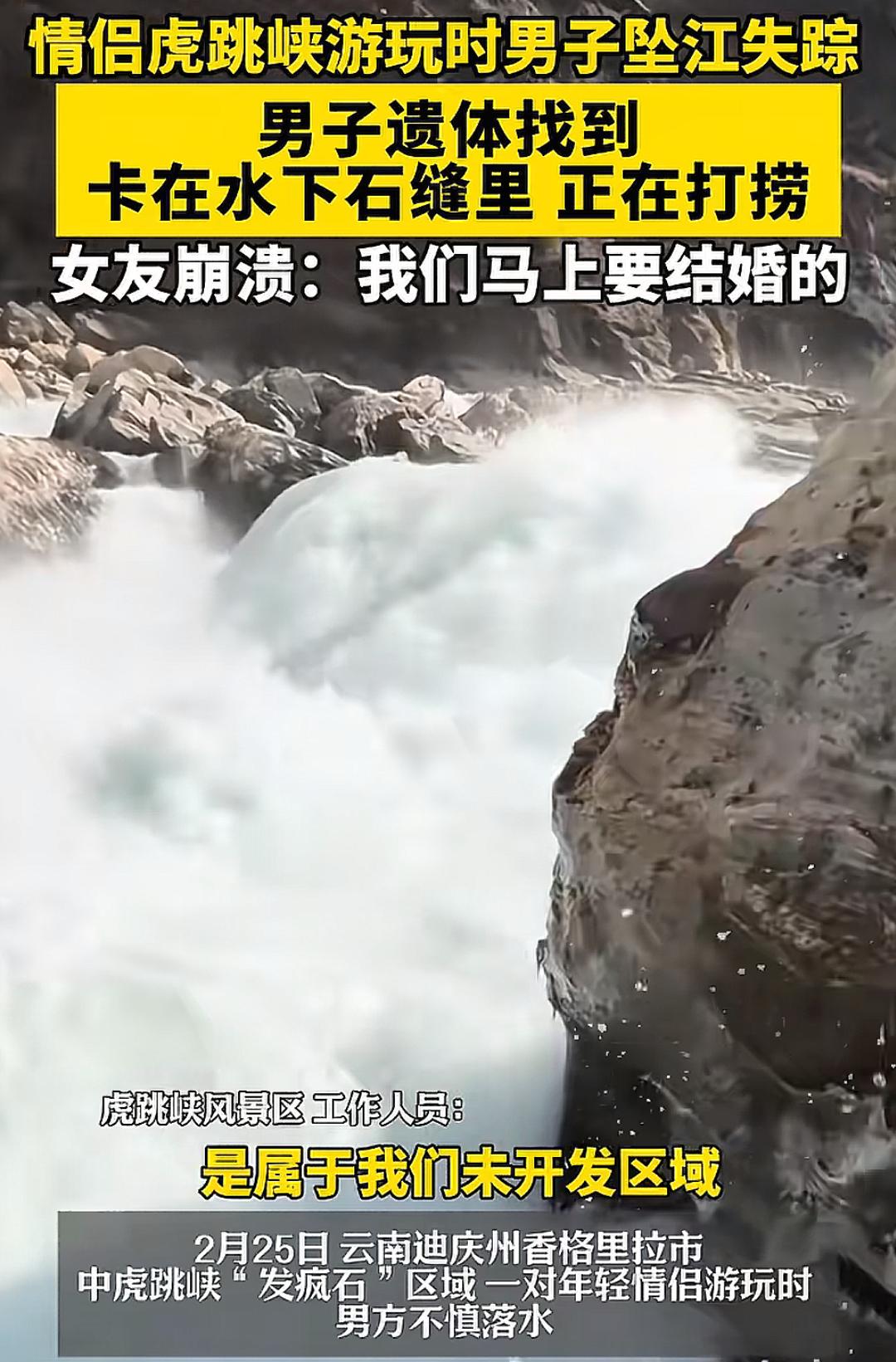 悲痛!在虎跳峡坠江的29岁男子遗体被找到了!卡在石头缝里面目全非,目前需要人下去把他带回来。女友哭的泣不成声,他们是来拍婚纱照的,这下子喜事变成了悲剧! 出事的这个男子名叫小杜,他出生1997年,是一名美术老师,性格温和热心,原本计划今年与女友结婚。 2月25日清晨,小杜与女友从丽江古城出发,前往中虎跳峡徒步游玩,同行的还有当地向导和其他游客。 当天下午一行人走到发疯石的区域,这里是属于未开发危险片区,但是也因为风景太美成为网红打卡点。 要我说啊,现在人还是太胆大了。我从小就恐高,就很怕大海,像虎跳峡这种我站远处看一下可以,离近点我心里面都毛毛的。 小杜当时水杯不小心沾了泥土,他也不知道咋想的,要在江边冲洗,女友劝他擦擦就行了他也不听。 当他弯腰到江边礁石上清洗,脚下一滑瞬间坠入金沙江,被湍急的江流卷走。 这个事故发生就在瞬息时间,再看时人已经不见了,即使后续动当地相关部分动用了人力和物力,也没有很快找到。 直到数十天后,被发现时小杜早已没了呼吸,并且受受江水负压吸附,打捞工作异常艰难。 潜水员下潜都得冒着被礁石卡住的生命危险,要我说啊,如果太危险还是不要冒险了吧,毕竟逝者已逝,活着的人更重要呀,大家怎么看呢