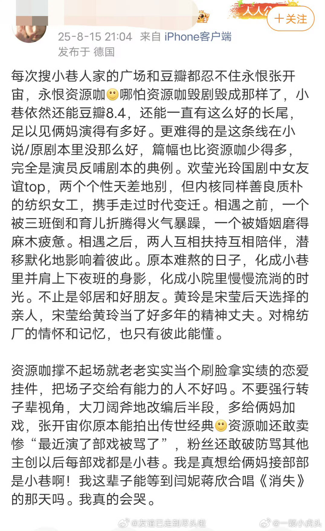 《小巷人家》原著作者兼编剧点赞吐槽正午阳光张开宙用zy咖毁剧的博文。
