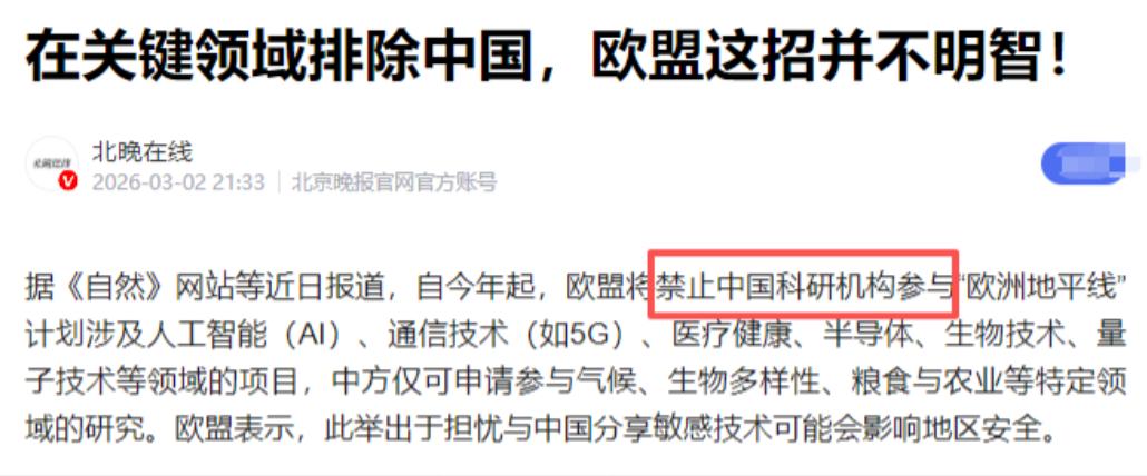 欧盟这波操作,真是又蠢又短视!历史又要重演了 欧盟正式官宣:禁止中国参与总预算930亿欧元的“地平线欧洲”核心计划,AI、量子、半导体、生物技术四大前沿领域全面封锁。 当年把我们踢出伽利略卫星导航,我们砸钱又受气,最后被逼自研。结果:北斗全球组网,反超伽利略。 美国航天搞沃尔夫条款,全面禁止和中国合作,结果:天宫空间站、探月探火全搞定。 封锁从来没困住中国,只会把我们逼成行业领导者。 说真的,看到欧盟这波操作,我第一反应就是:怎么又来?不长记性吗?明明历史就摆在眼前,非要重蹈覆辙,既蠢又短视,最后只能自己打自己的脸。 先说说这次的“地平线欧洲”计划,欧盟吹得天花乱坠,说这是他们有史以来规模最大的研究与创新计划,总预算接近千亿欧元,目的是提升欧洲的科技竞争力。 可转头就把中国拒之门外,还特意圈定了AI、量子、半导体、生物技术这四大前沿领域,全面封锁,理由说得冠冕堂皇,说是“担心敏感技术泄露,影响地区安全”。 可稍微有点常识的人都知道,根据欧盟委员会官网自己的介绍,这个计划“独家关注民用应用”,根本就没有什么能影响所谓“地区安全”的敏感技术。 说白了,就是欧盟跟着美国学,搞“小院高墙”那一套,把科研合作政治化、泛安全化,怕中国在这些领域超过他们,就想通过封锁来遏制我们的发展,何其可笑。 还记得当年的伽利略卫星导航系统,那时候我们的卫星导航技术确实落后,欧洲为了不依赖美国的GPS,主动向我们抛出橄榄枝,邀请我们一起合作。我们拿出了2.7亿美元的诚意,实打实砸了钱,结果呢?欧盟内部各国明争暗斗,项目一再推迟,而我们作为投资方,却被彻底排挤在核心技术之外,连主导机构的门都摸不到。 后来的事情大家都知道了,2018年,北斗三号基本系统建成,正式向全球提供服务,比伽利略系统更早实现全球组网,性能也全面反超。 现在,北斗已经广泛应用在我们生活的方方面面,从手机导航到农业生产,从交通运输到国防建设,而伽利略呢?因为内部分歧不断,项目进展缓慢,至今还在不断完善中,早已被北斗甩在了身后。 无独有偶,美国当年也干过一模一样的傻事。2011年,美国国会通过了沃尔夫条款,禁止NASA和中国开展任何联合科研活动,甚至不让中国官方访问者进入美国航天局的设施,理由更是荒唐,仅凭一个莫须有的“间谍”事件,就想彻底阻断中国航天的发展之路。 那时候,美国以为这样就能困住我们,可他们万万没想到,越是封锁,我们的斗志就越强。 没有合作机会,我们就自己摸索;没有技术借鉴,我们就自主研发。短短十几年时间,我们建成了天宫空间站,成为全球唯一在轨运行的空间站,美国宇航员后来都得蹭我们的飞船才能进入太空;我们的嫦娥系列探测器成功探月,取回月壤,天问一号着陆火星,实现了从月球到火星的跨越,把美国当年的封锁狠狠踩在了脚下。 现在欧盟又来这套,真的让人看不懂。他们难道忘了,中欧科研合作这些年一直很紧密,截至2025年底,中国还在参与“地平线欧洲”计划中的107个项目,双方合作的论文数量快要超过中美合作,引用影响力也和美欧合作持平。中国在他们封锁的四大领域,早就不是当年的水平了——我们已经成为全球AI研究的最大产出国,在量子技术领域和美国争夺主导地位,半导体和生物技术也在快速突破,取得了一系列重大成果。 欧盟以为封锁就能保住自己的优势,却忘了,科技发展从来不是闭门造车,需要开放合作、优势互补。他们把中国排除在外,错失的不仅仅是与中国科学家联手解决全球挑战的机会,更是中国这个庞大的市场和先进的技术资源。要知道,欧盟自身也在大量补贴科技产业,却反过来指责中国的补贴政策,双标的嘴脸暴露无遗。 更可笑的是,欧盟内部也不是铁板一块,德国、荷兰等21个国家公开反对这种极端的保护主义,他们清楚地知道,对华封锁只会反噬欧洲自己的制造业,推高国内通胀,吓跑外来投资。可欧盟的一些政客,被零和博弈的思维冲昏了头脑,一门心思跟着美国走,最终只会让欧洲陷入孤立。 历史已经一次次证明,封锁从来不是枷锁,而是催化剂。欧盟今天的短视操作,终究会成为明天的笑话。而中国,会在一次次的封锁中,不断突破、不断成长,用实力证明,我们从来不需要看别人的脸色,靠自己,就能走出一条属于自己的强国之路。