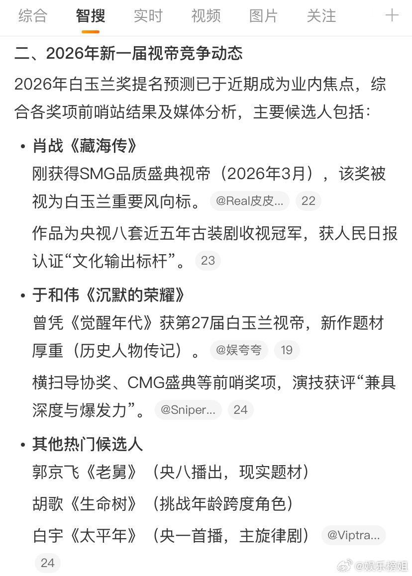 历届白玉兰奖视帝截至2025年第30届白玉兰奖的完整视帝名单🈶 2026年新一届视帝角逐中,肖战于和伟等因作品热度与演技表现成为热门候选人。