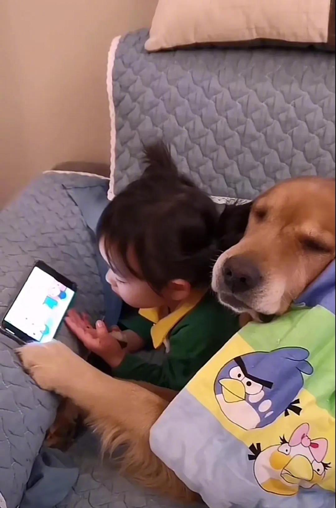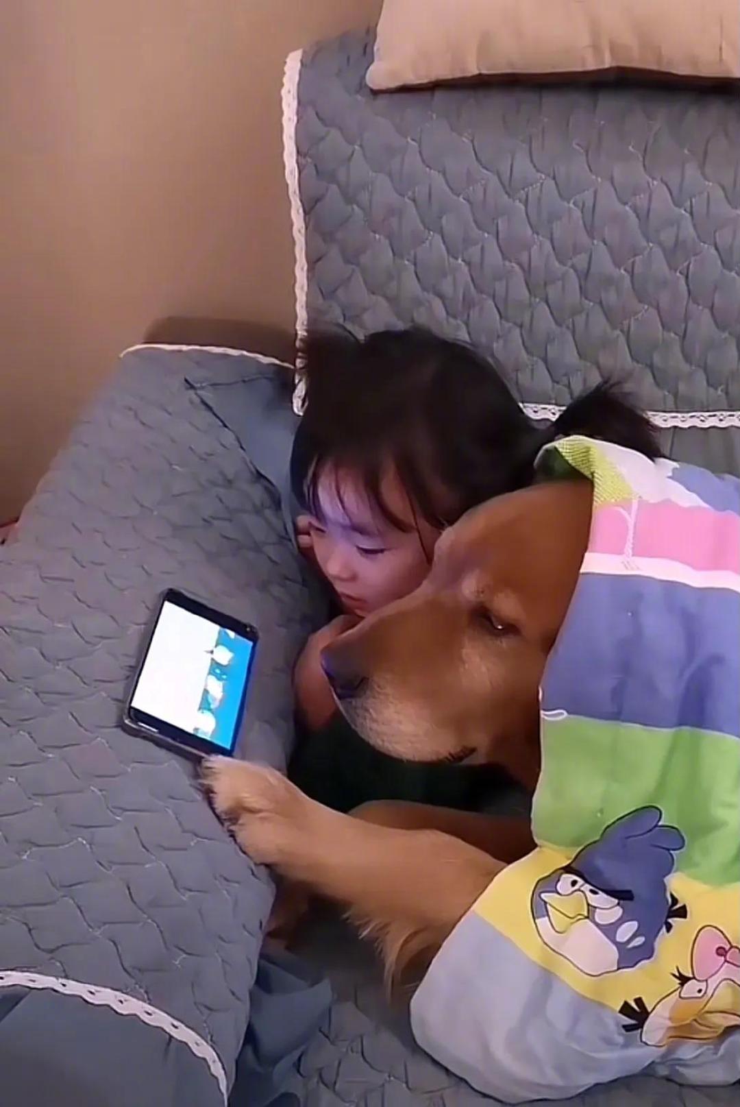 快乐的童年,离不开狗子的陪伴,一起睡觉,一起看动画片,很和谐。