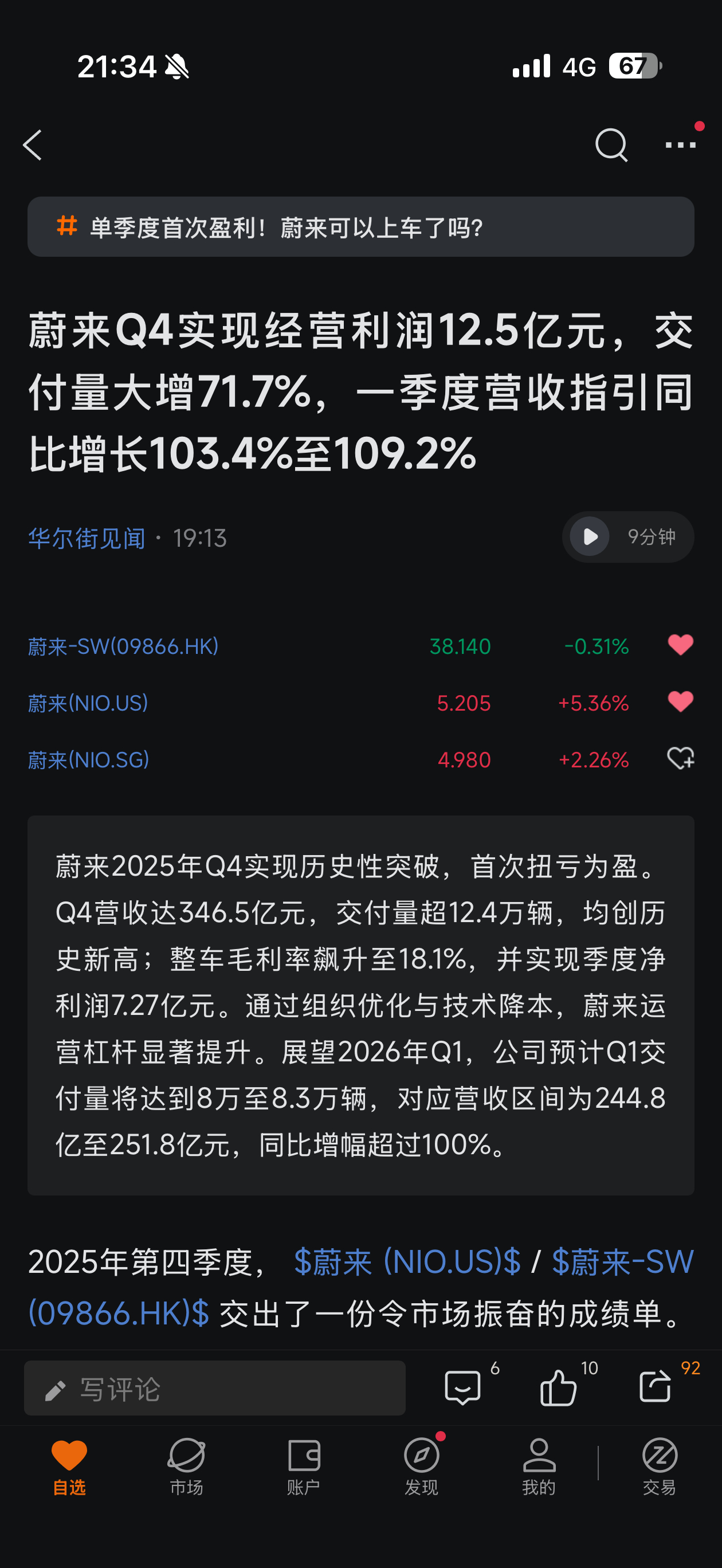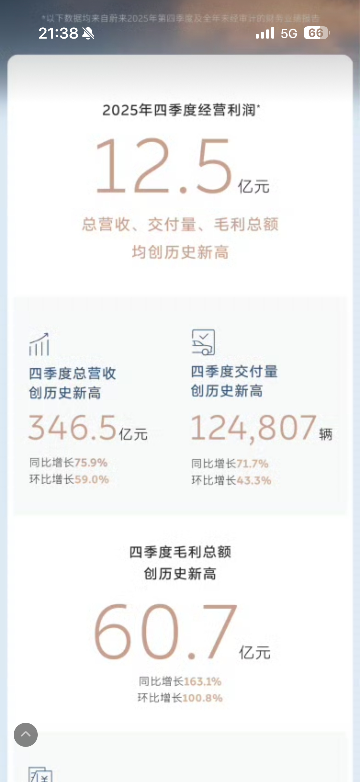 蔚来四季度盈利12.5亿元蔚来Q4实现经营利润12.5亿元,交付量大增71.7%历史性突破,首次扭亏为盈,美股开盘大涨这其中蔚来ES8和租电方案居功至伟连续三个月全尺寸SUV销冠这半年前谁敢想