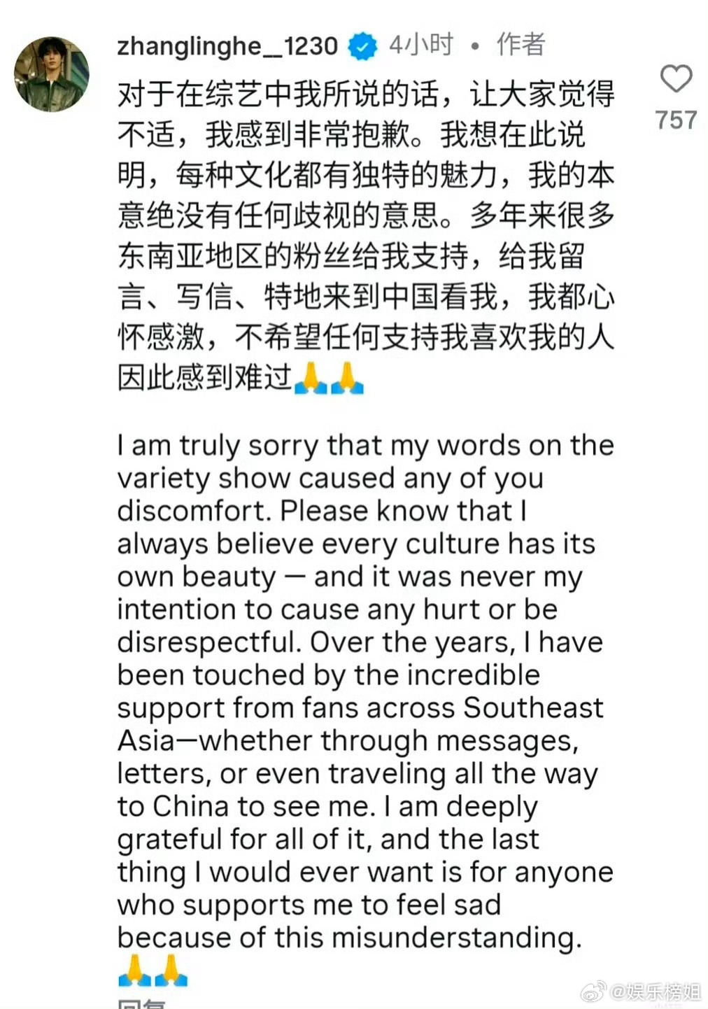 张凌赫外网口碑张凌赫对东南亚粉丝心存感激。没有任何歧视意思 本意并非如此。感谢海