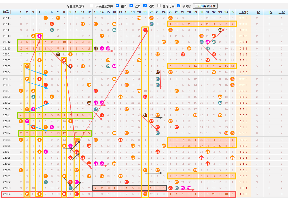 一、(三区选择)30期中断一区4次,断二区1次,断三区6次。三区次数居多。整体走势来看,一区号码居多。断一区之后,号码回落热号为主,斜连号走势是重点。三区在断区之后号码回补个数稳定一些,冷热号码组合为主。本期区间比看好1:2:2。防守0:2:3。