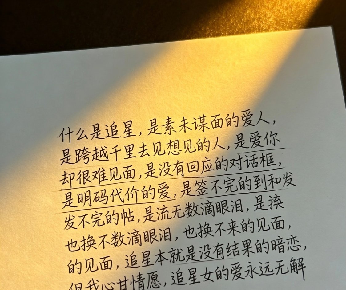 只有追星女才懂这一刻的含金量看着他从小舞台到大舞台,从没人认识到全场应援,这种感觉比中彩票还开心。虽然他不认识我,但我见证了他的成长,这过程里的酸甜苦辣,都是我这辈子最珍贵的回忆。值了!