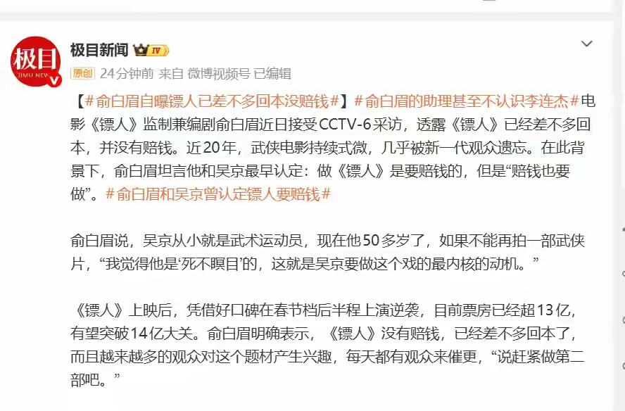 《镖人》一直在欺骗我们! 吴京电影《镖人》虽然不是今年春节档冠军,但是可以说是最吸引眼球的一部!从筹备到拍摄,到上映,各种新闻不断,备受关注! 在这些所有“新闻”里,有一件事却出现了反转。之前媒体报道说这部电影投资5个多亿,还有说7个亿的。按照我们国家分账比例,投资方在所有票房里,大概分得约3成!按照这个算法,如果是7个亿成本,那么最少得20亿以上才能回本;如果是5个亿成本,最少得15亿回本! 但是,但是!今天这部戏的监制俞白眉却说:这部戏现在已经基本上回本了,没赔钱,可以筹备第二部了!可是到现在为止,《镖人》票房才13亿! 这样说来,《镖人》其实一直在骗我们,这部戏的成本压根不是7亿,也不是5亿!成本大概就在4亿左右! 这让我想起,前几天导演王晶发的一段视频,对于电影的真正制作成本,他说一部动作片,成本1.3亿已经很好了!但是不知道为什么,总是有一些电影,喜欢夸大制作成本!《镖人》就是其中之一! 这到底是为什么呢?