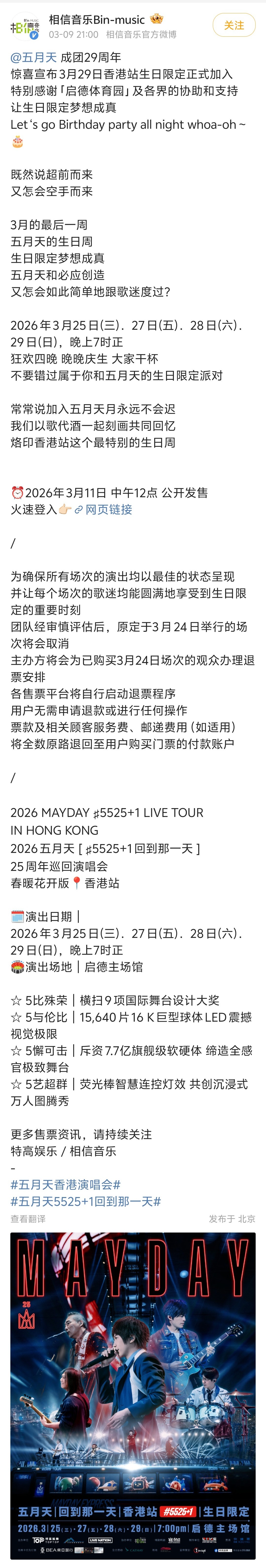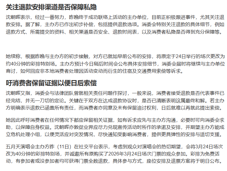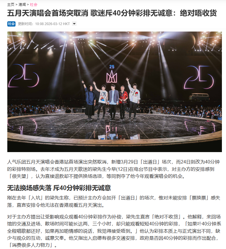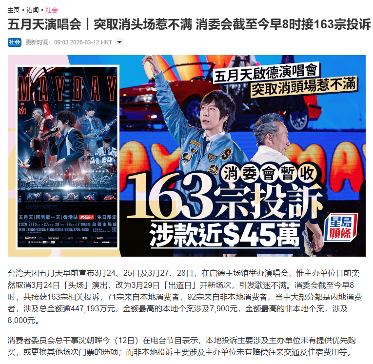 【香港消委会收到超百件五月天演唱会投诉】五月天演唱会首场取消引观众投诉 近日,原定3月24日、25日、27日、28日在香港举办演唱会的五月天突然宣布,取消3月24日“头场”演出,改为3月29日“出道日”开新场次,引发歌迷不满。主办方称,会将3月24日场次改为40分钟的彩排特别场,并诚邀原本购买了当日演唱会门票的观众免费参加,有参加者或没参加者均可获得门票全数退款。香港消费者委员会表示,截至12日8时,共收到163宗有关五月天演唱会相关投诉,涉及总金额逾44万元,其中金额最高的个案涉及8000元。本地投诉主要涉及主办单位未有提供优先购买,或更换其他场次门票的选项;而非本地投诉主要涉及主办单位未有赔偿往来交通及住宿费用等。(星岛头条)