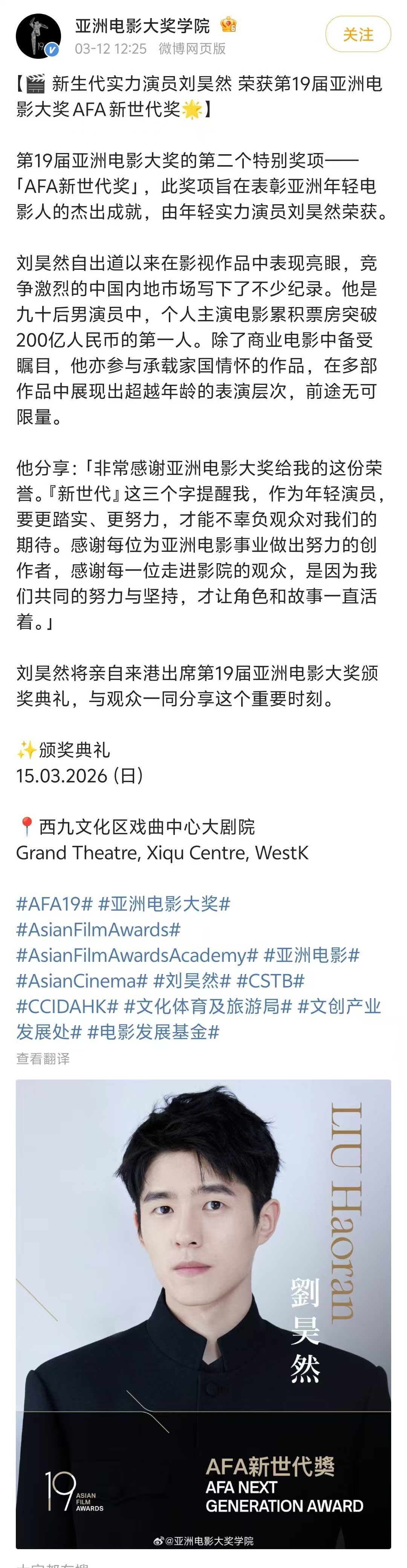 【刘昊然获得亚洲电影大奖AFA新世代奖】刘昊然主演电影票房超200亿 据亚洲电影大奖学院,演员获第19届亚洲电影大奖AFA新世代奖。自出道以来,他在影视作品中表现亮眼,也是九零后男演员中,个人主演电影累积票房突破200亿人民币的第一人。刘昊然说,“‘新世代’这三个字提醒我,作为年轻演员,要更踏实、更努力,才能不辜负观众对我们的期待。感谢每位为亚洲电影事业做出努力的创作者,感谢每一位走进影院的观众,是因为我们共同的努力与坚持,才让角色和故事一直活着。”