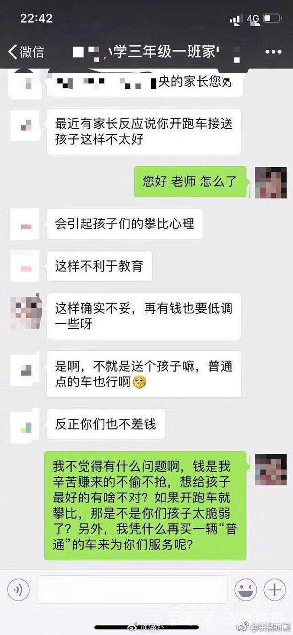 【家长开跑车接送孩子被移出群[摊手],老师:会引起攀比心理】网友爆料:有家长开跑车接送孩子上学,老师和其他家长认为会引起孩子攀比心理,不利于教育,跑车家长回怼,却被移出群……对于这事,你啥看法?