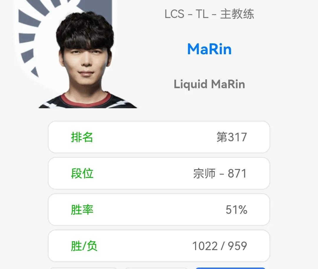 31岁的Marin,这竞技状态,保持的真好! 提到前SKT上单选手Marin,老玩家都不陌生,S5的冠军FMVP,曾经正反手教育AJ,巅峰期制霸上路,无人可挡。 虽然退役多年,但是竞技状态一直在线,韩服一直保持在千分上下,这不,前几天又是一波六连胜。要知道Marin,今年已经31岁了,可见天赋之强。 而前段时间,韩网有个投票,关于LOL历史上单排名,Marin人气高涨,仅次于The shy,位列历史第二名。 最近转会期,Marin官宣加入北美TL战队,担当主教练一职,明年会带着今年的冠军打野P小将等人,共同征战LCS赛区。
