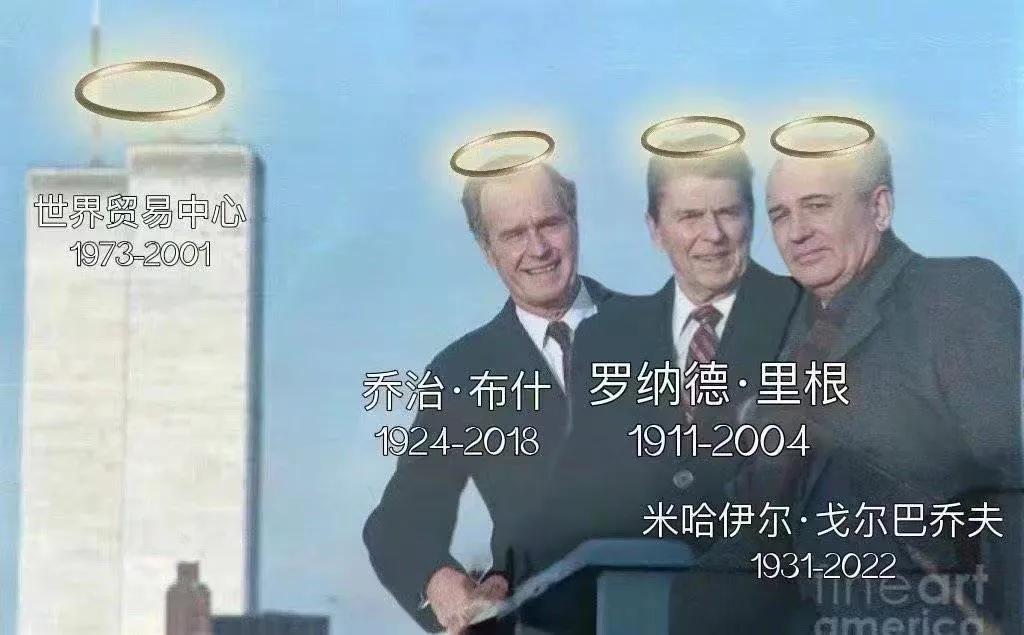今天最新消息,苏联最后一任最高领导人戈尔巴乔夫因病亡故,享年91岁。戈尔巴乔夫任上实施了诸多鲁莽激进的“改革”,搞所谓“新思维”,走到改旗易帜的邪路上,最终导致苏联解体毁灭,成为千古罪人。 第二张图中出现的老布什、里根早些年已经去世,这次戈尔巴乔夫也没了,可彩云没想到的是最早没的居然是他们拍照的背景纽约世贸中心双塔楼——2001年9.11事件时毁灭了。[捂脸]