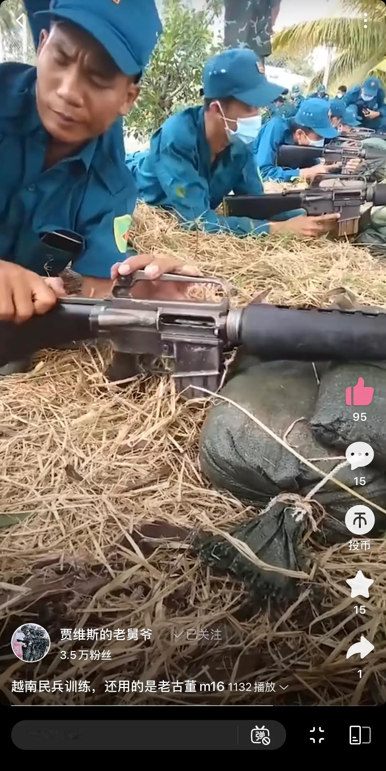 【越南民兵的M16步枪】 一段越南民兵训练的短视频中,我们可以看到越南还有不少留用的M16A1步枪,这是越南战争时期美军制式步枪,也是第一种正式列装的小口径突击步枪,发射5.56mmM193步枪弹。这种步枪弹初速很高,弹头击中人体时很容易失稳破碎,在突击步枪有效射程内有极强的杀伤力。 从视频中可以看出,越南留用的这些M16A1枪况不好,铝合金表面的氧化涂层已经剥落磨损,露出灰白色的铝合金本色,毕竟这些都是60多年的老枪了。 轻兵器科普