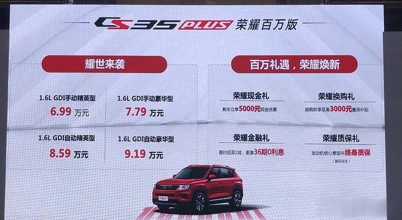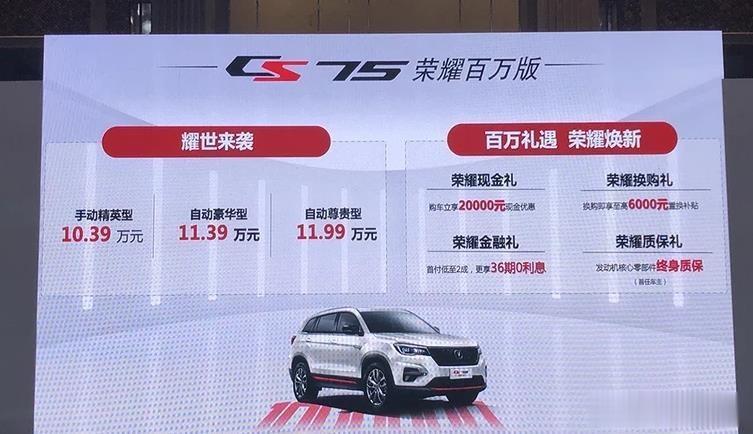 长安CS35PLUS荣耀百万版和长安CS75荣耀百万版上市,其中长安CS35PLUS荣耀百万版指导价是6.99万元-9.19万元。而长安CS75荣耀百万版指导价是10.39万元-11.99万元。 对于这两款车来说,长安CS35PLUS荣耀百万版定位是入门级,搭载的是1.6L自然吸气发动机,匹配的是可模拟8速的CVT无级变速箱和5速手动变速箱,最大功率94kW(128PS),最大扭矩161N·m。性能就是入门级SUV,毕竟6.99万起的价格,消费者也不能要求太多。 而长安CS75荣耀百万版搭载的就是长安CS75 PLUS的同款1.5T发动机,但变速箱是7DCT和6速手动变速箱,这款变速箱来说性能确实不及1.5T蓝鲸NE系列强,但对于一款10万出头的紧凑型SUV也不错了。