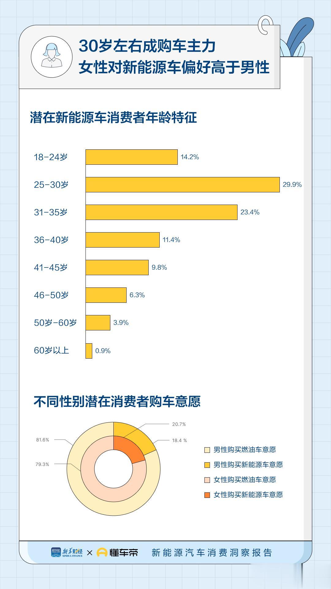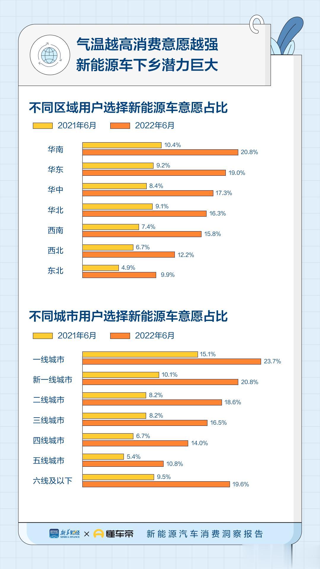 新能源汽车下乡前景如何?从懂车帝联合新华财经发布《新能源汽车消费洞察报告》来看,新能源汽车下乡潜力巨大。 我们可以看到,与2021年6月相比,2022年6月各地区用户选择新能源汽车意愿占比都大涨。之前我们总说:若一个地区没有限牌、限行,谁会选择新能源汽车?但从四、五、六线城市来看,消费者对于新能源汽车的意愿都非常高!(四、五、六线城市基本上就不存在限牌、限行的情况) 六线城市用户对新能源汽车意愿的占比都与新一线城市差不多了,比起二线城市还更高,这就非常有意思了!这样的情况谁还敢说买新能源就是为了绿牌,不限行? 对于六线城市而言,不少就是我们所谓的“农村地区”,对于这些城市,其实他更容易推广新能源汽车,毕竟充电桩问题不算是问题,当自己家里都可以安装充电桩了,还用担心补能问题吗?加上新能源汽车整体的用车成本确实低很多,新能源汽车下乡的前景确实非常广阔。 从懂车帝联合新华财经发布《新能源汽车消费洞察报告》来看,女性购买新能源车意愿也比男性更高,这也是非常有意思的,之前我们会认为,男性朋友更容易接受新能源汽车,事实上,完全不是如此。