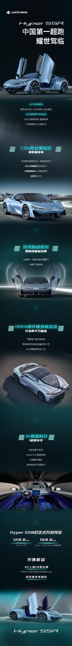 9月15日,埃安推出了自己的全新高端品牌Hyper昊铂,并发布了Hyper旗下的首款车型——中国第一超跑Hyper SSR,以一款纯电、100%中国造的高性能超跑干净利落的结束了中国无超跑的历史。 说到超跑,大家自然联想到的是国外血统、出挑的造型、惊人的动力以及数百万甚至上千万的高昂售价……只不过这些即将成为过往,因为“中国制造”的Hyper SSR已经来了。 Hyper SSR售价128.6万元,Hyper SSR Ultimate赛道版售价168.6万元,然而却有底气说出“对手都在500万元以上”这样的话,它的底气源自百公里加速1.9s、源自比F1赛事标准还要高出1.5倍的1225匹综合马力、源自高达12000N·m的轮上峰值扭矩……即日起下订,提车后还可享受“SCC”和“19号公路”中国两大顶级超跑俱乐部推荐入会的权益,参与埃安赛车车房日活动,进入中国最有价值的顶流朋友圈,开启梦寐以求的超跑人生。 相信未来以Hyper SSR为起点的中国超跑,将和所有“中国制造”一样,完成进入市场、碾压对手、占领市场的光荣使命,再次证明中国制造的实力!