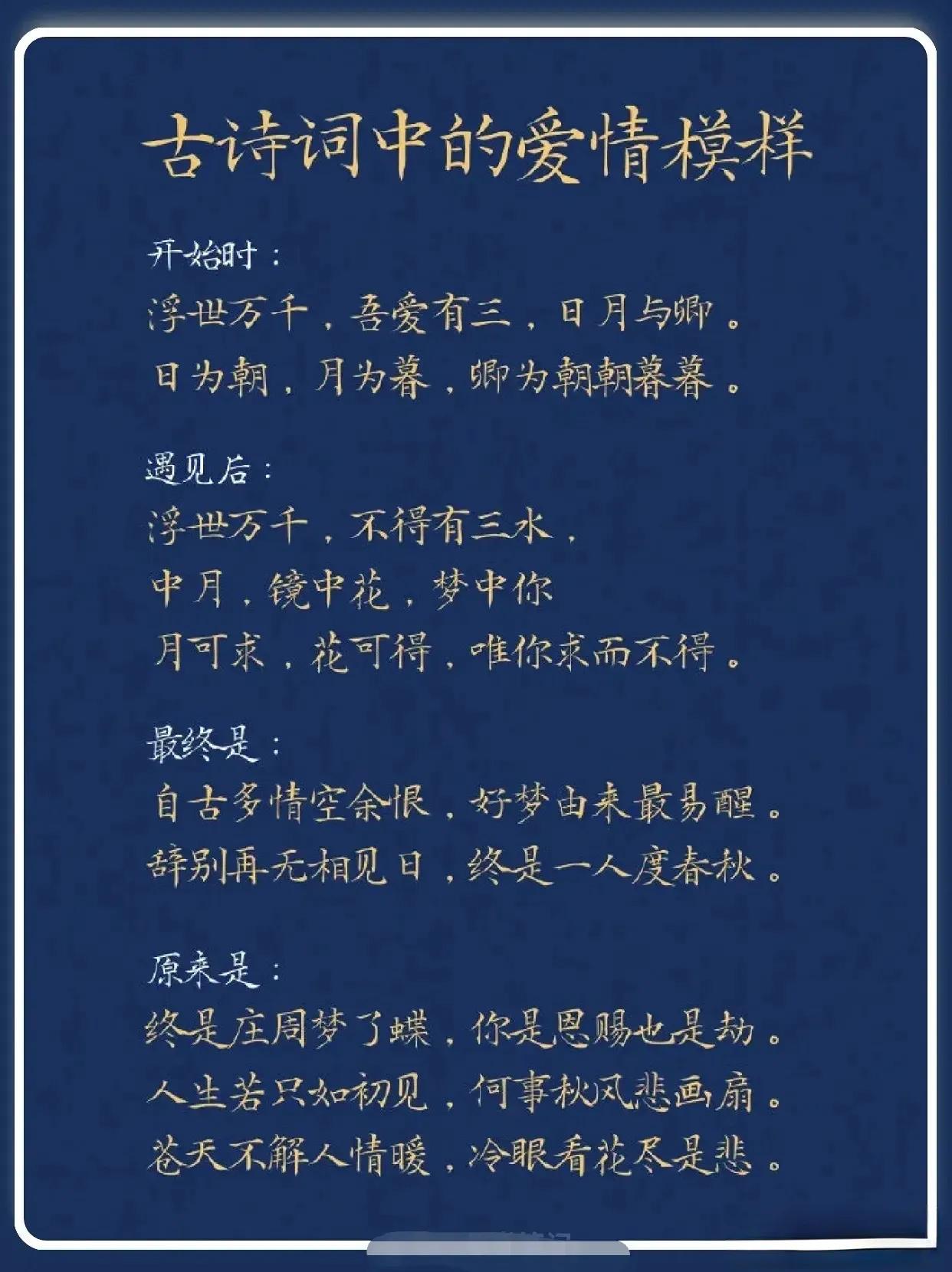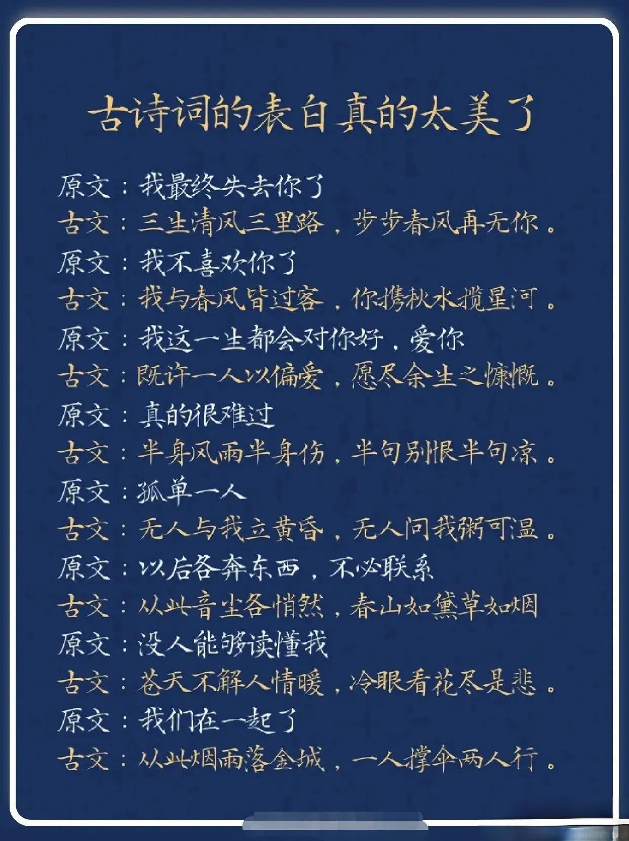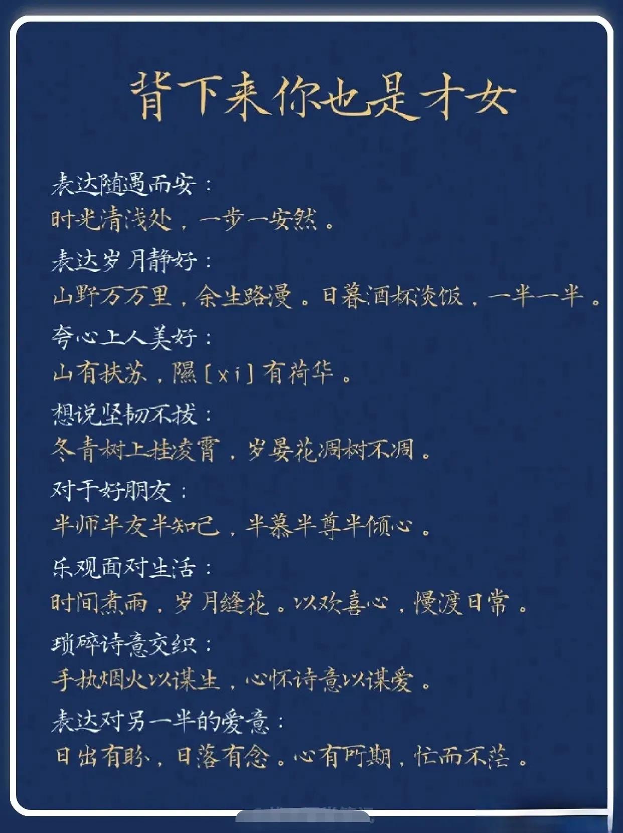 天呐!!央视的顶级文案,简直太美了!!背下来你也可以成为才子,每一句都是经典中的经典,被深深折服了,原来语言真的可以这么美。 时光清浅处,一步一安然; 三生清风三里路,步步春风在无你。 闲暇时间多看一看,运用的文章里,可以为文章增色不少。