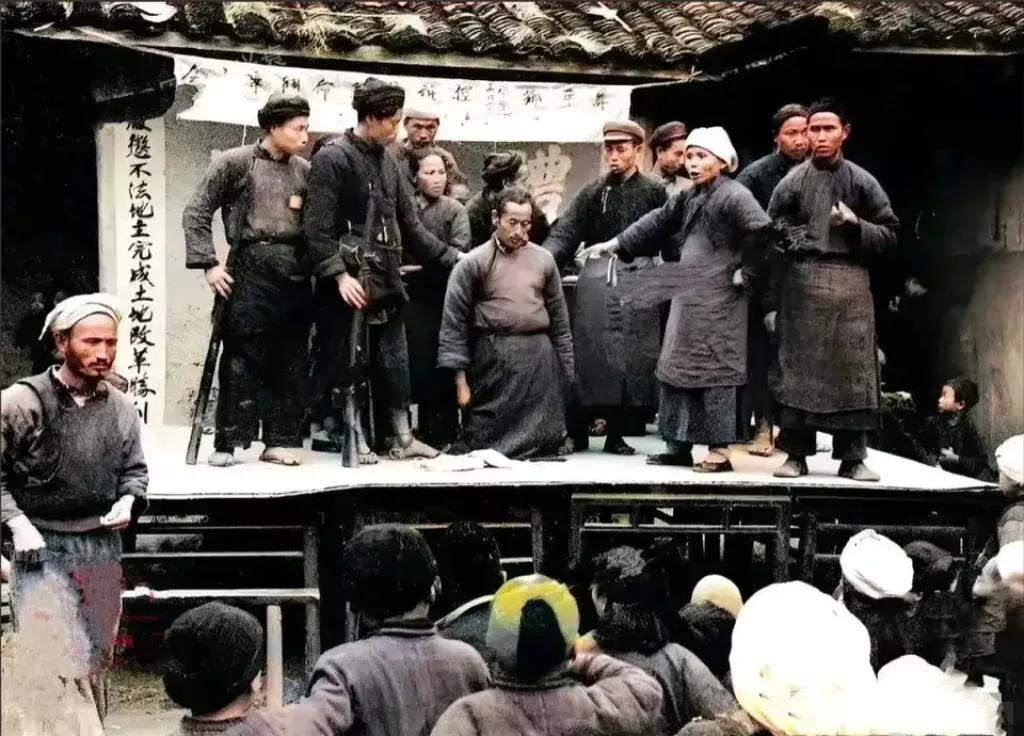 上世纪50年代,斗地主的真实场景。 翻身佃农把地主揪到方桌拼起来的批斗台上,让其跪下,群众代表在旁边控诉地主的“黑历史”。 其实那个年代的地主很多都是种粮能手,勤俭持家,买了土地。农忙时节,他们和长工同吃同住,也并不都是恶贯满盈的坏人。