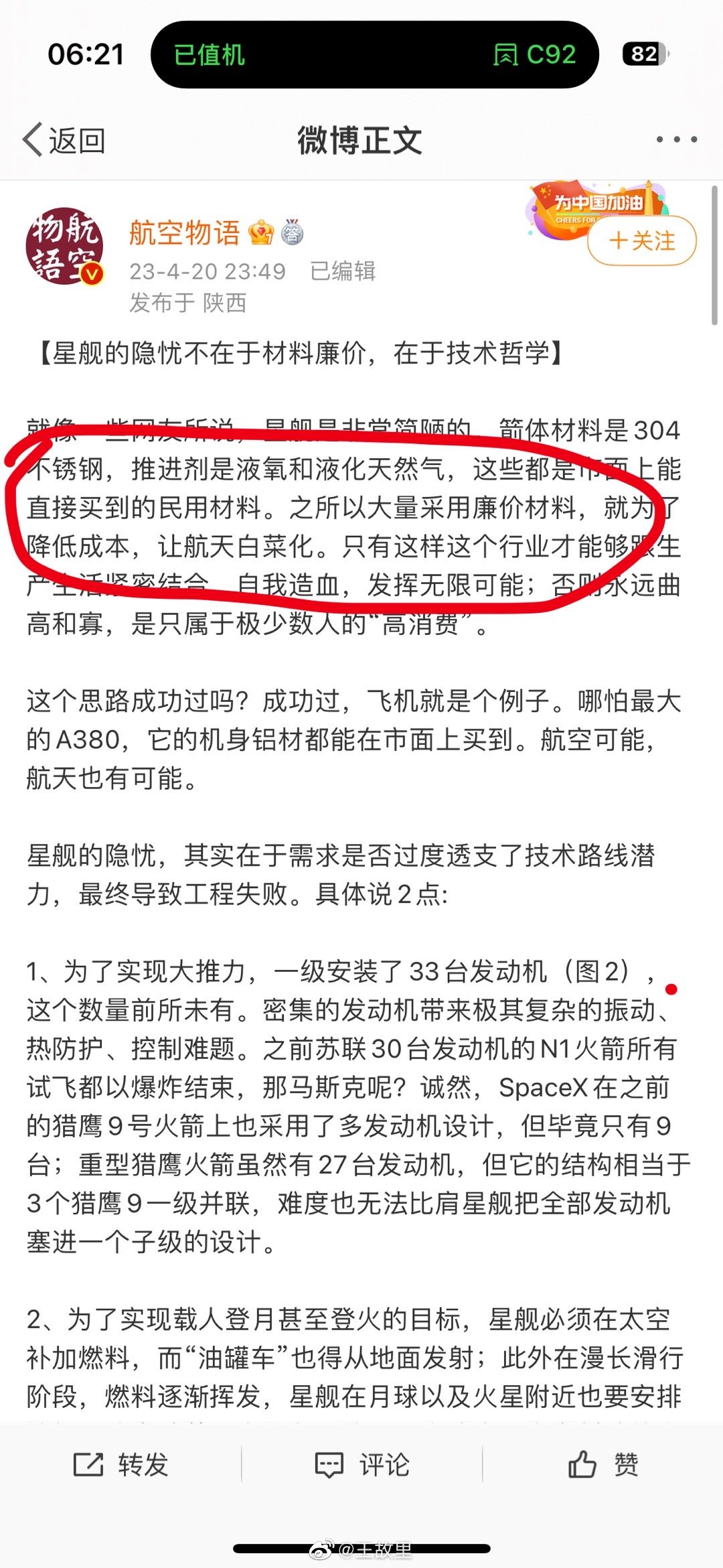 航空物语简单直接的说明白了,马斯克采用的航天策略是让航天白菜化,所用的304 不锈钢和燃料都是市面上可以买到的,意在降低行业门槛,实现自我造血的能力